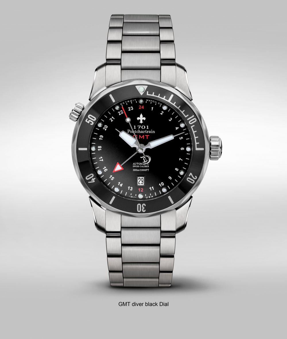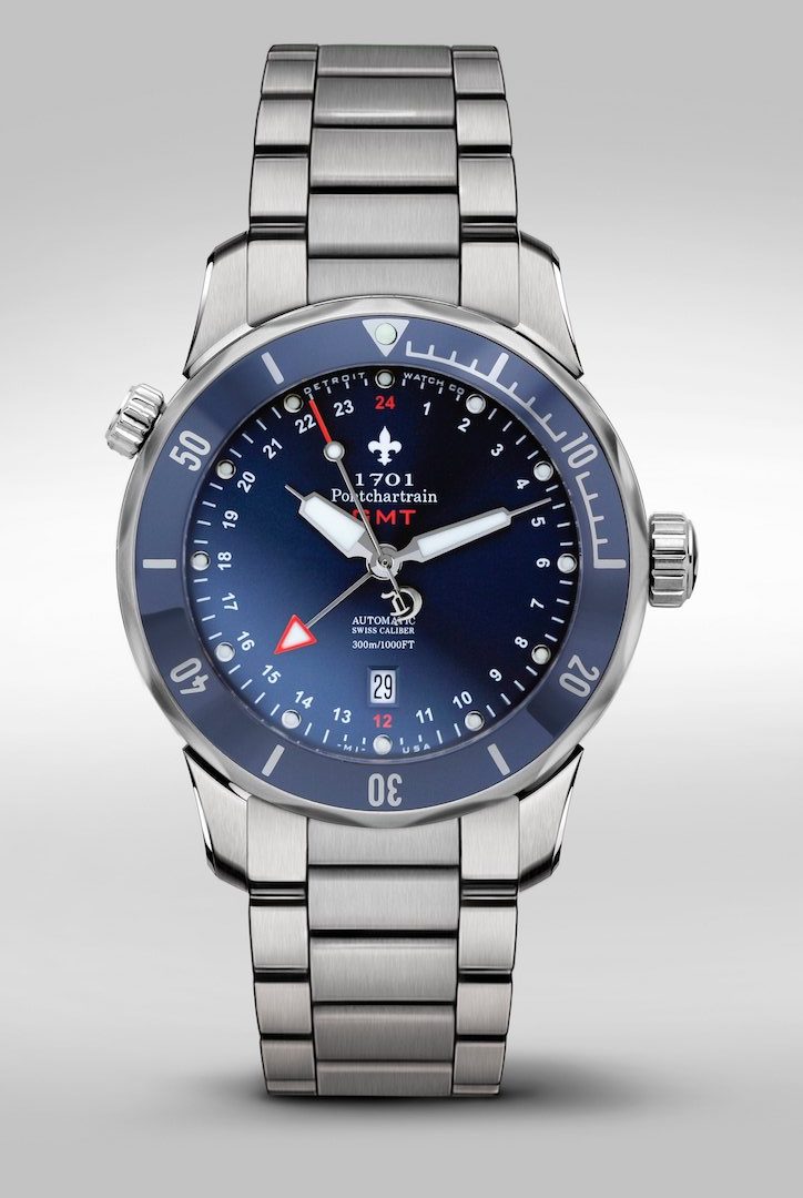 The fantastically designed and crafted Detroit Watch Company 1701 Pontchartrain® Great Lakes Edition GMT Diver ($1495) boasts brushed and polished accents on the 43mm case, which sits stylishly on the wrist without being ostentatious. It has an automatic self-winding Swiss movement with date window and sweep second hand. The screw down crown with black and white Detroit Fleur-de-Lys is a striking design feature of this wonderful timepiece from the Detroit Watch Company.