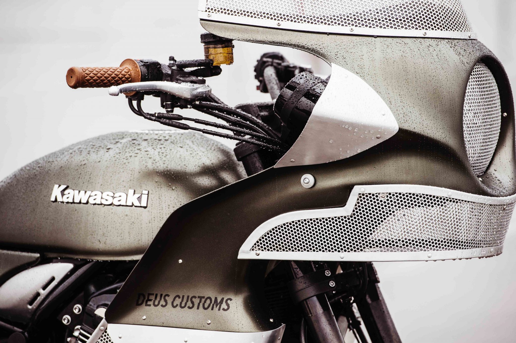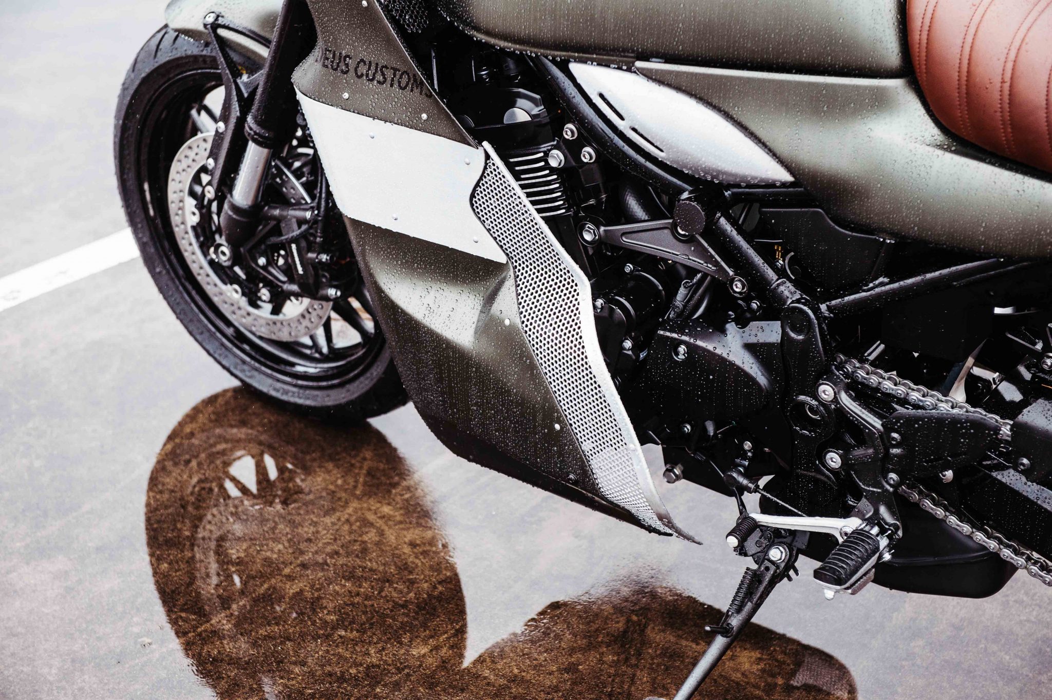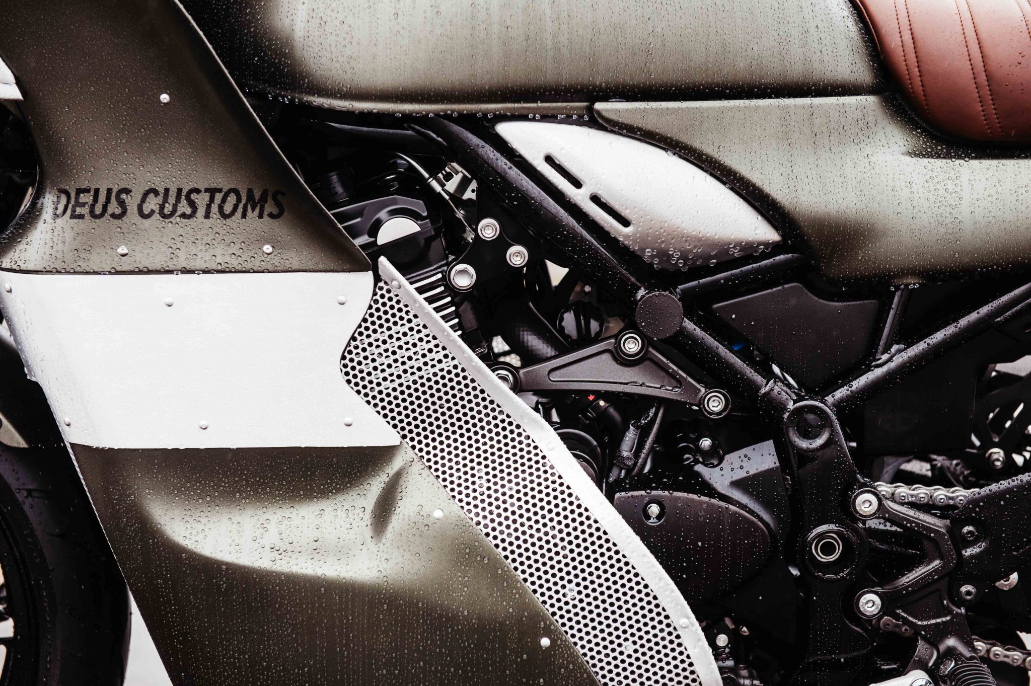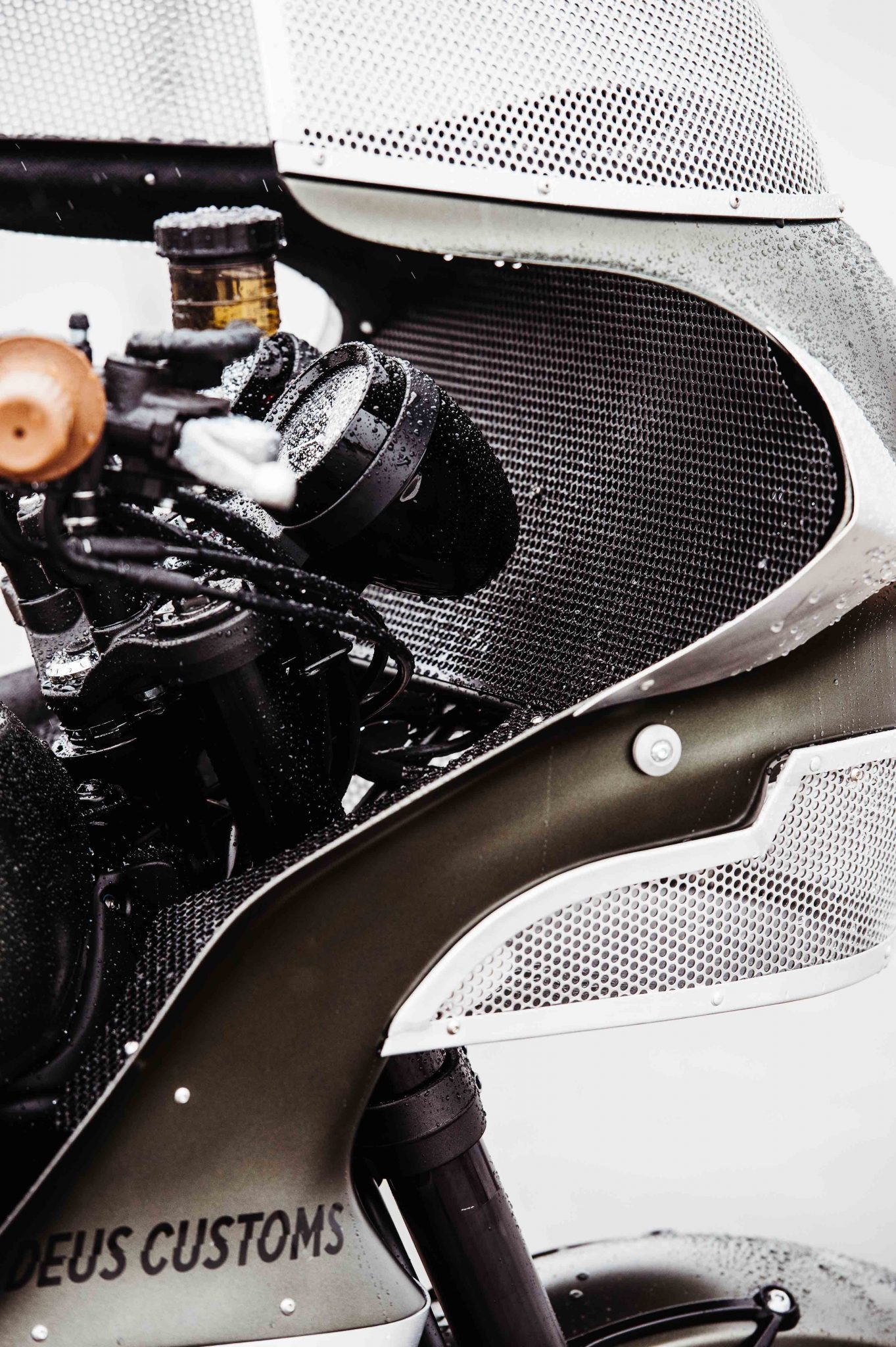The headlight of the Deus Ex Machina The Goose Motorbike was hidden behind a perforated screen and alloy was added to the fairing to give it a distinctive look. The skirt of the fairing needed some modifying as well to accept the 948cc in-line four-cylinder engine. Rather than fit an aftermarket exhaust to the engine, Deus Customs decided to shorten and de-tab the stock exhaust. From there it was covered with a black ceramic coating by Hi-Octane Racing.
