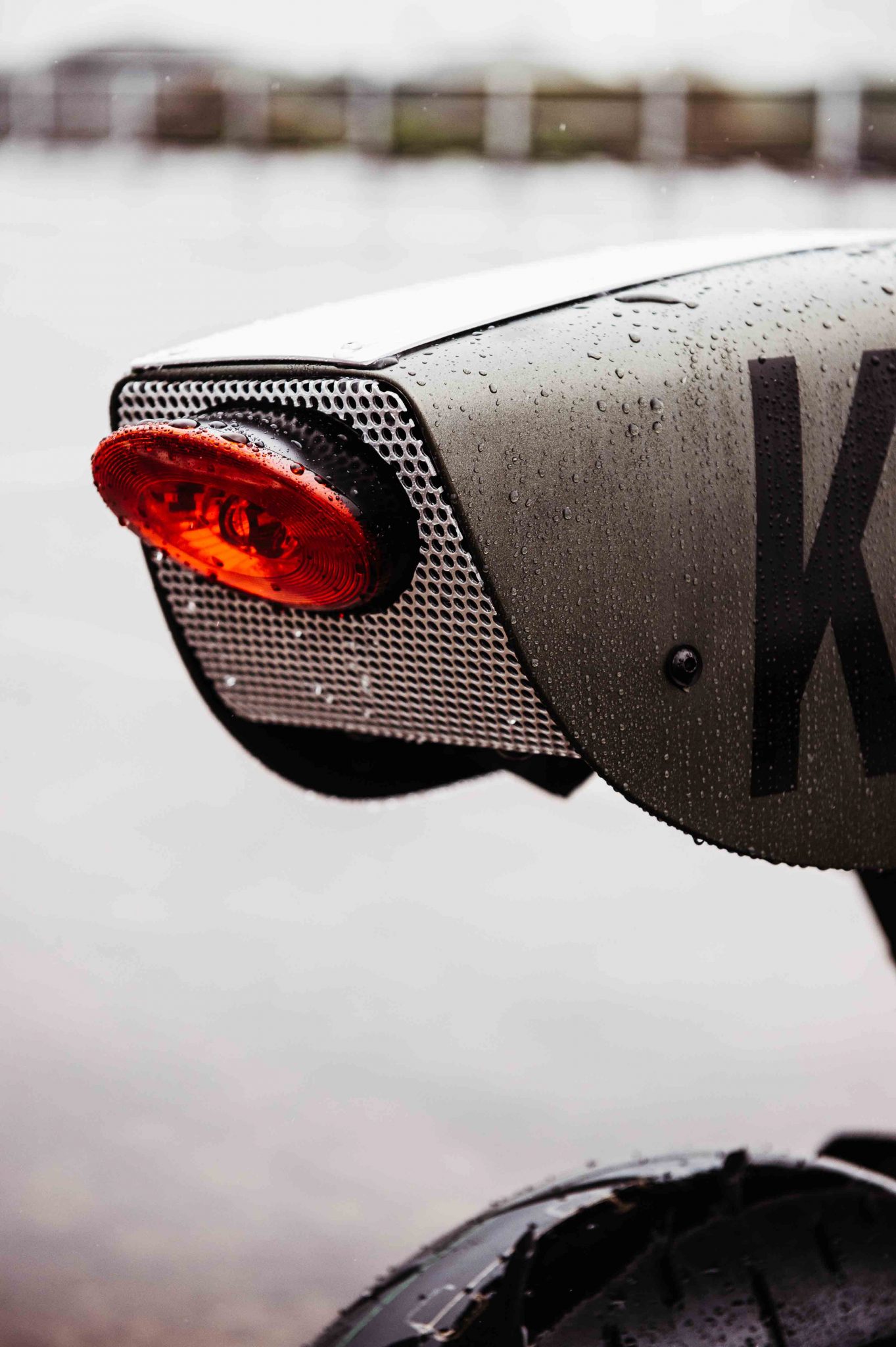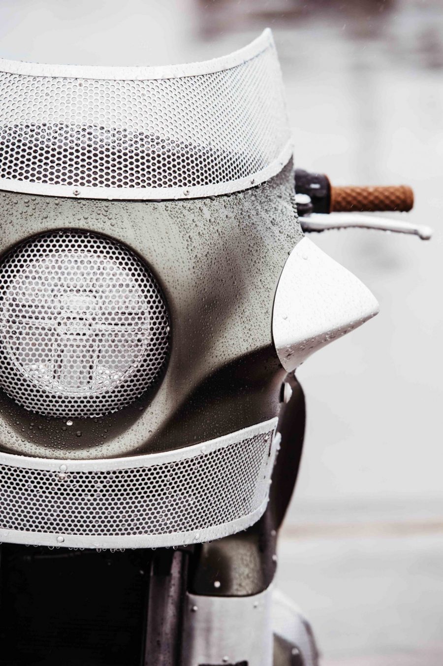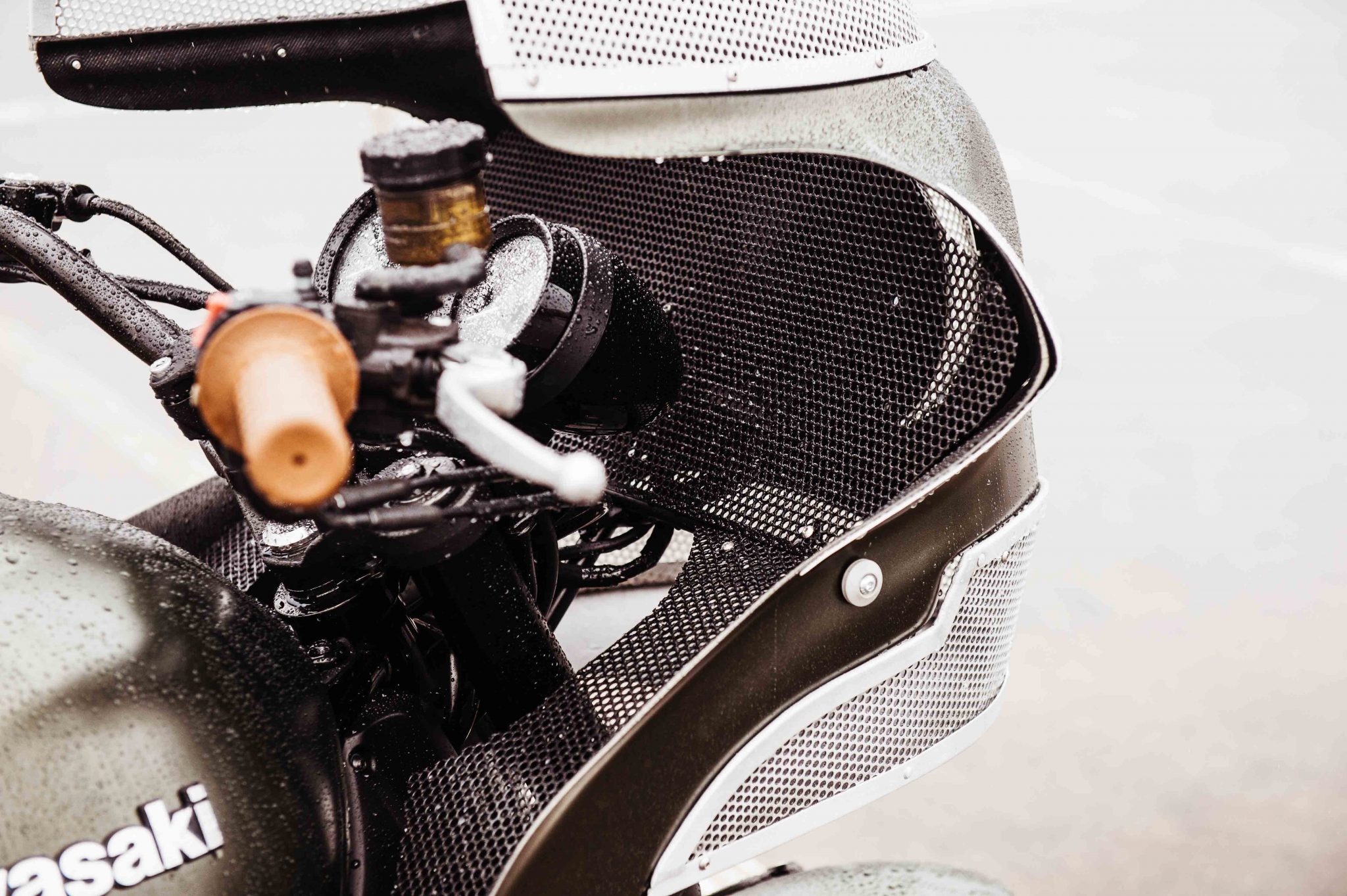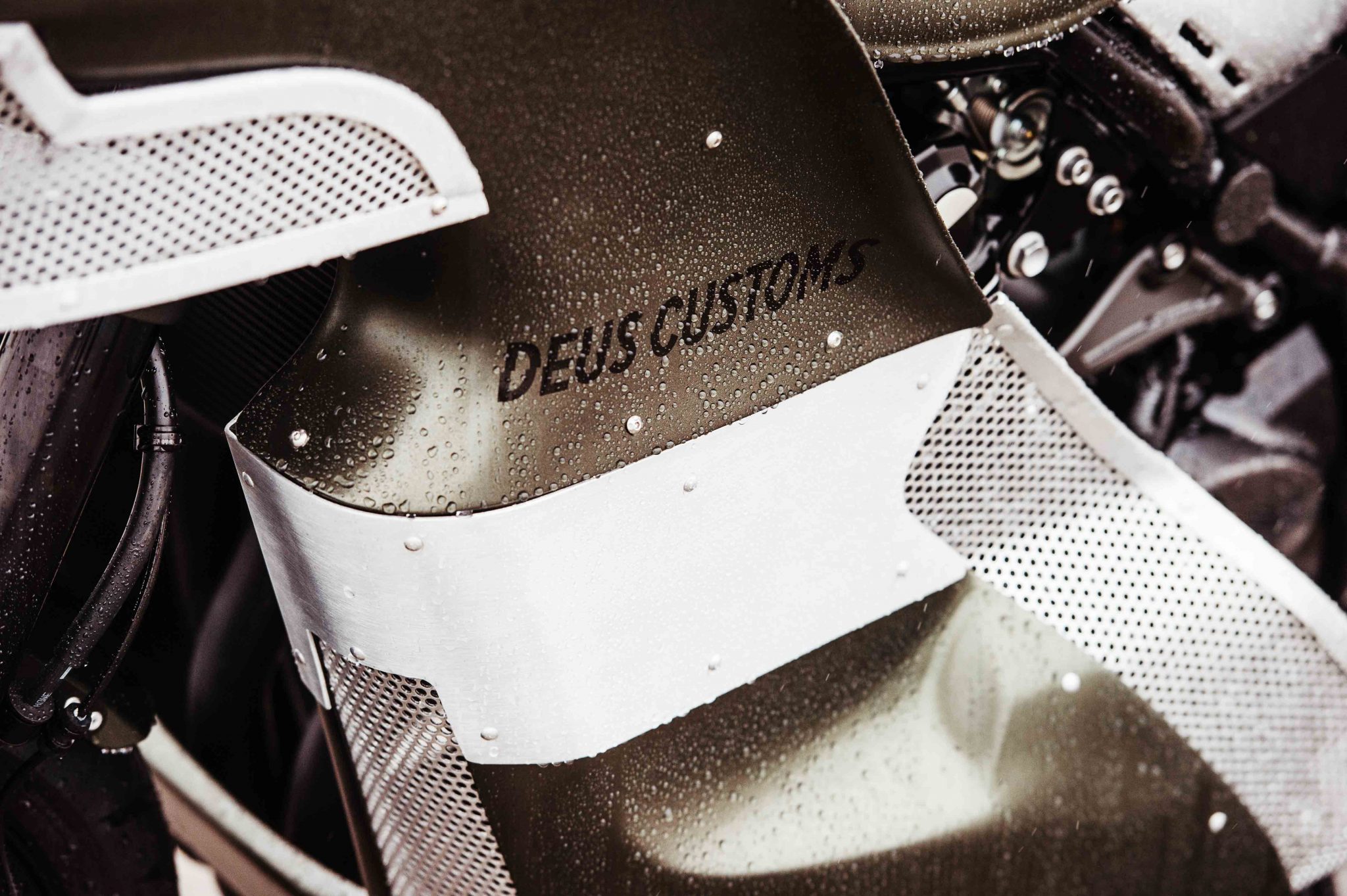 The headlight of the Deus Ex Machina The Goose Motorbike was hidden behind a perforated screen and alloy was added to the fairing to give it a distinctive look. The skirt of the fairing needed some modifying as well to accept the 948cc in-line four-cylinder engine. Rather than fit an aftermarket exhaust to the engine, Deus Customs decided to shorten and de-tab the stock exhaust. From there it was covered with a black ceramic coating by Hi-Octane Racing.