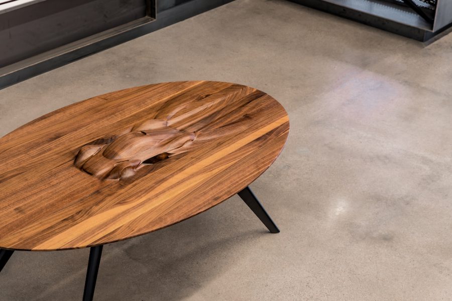 Measuring 4 feet long by 4 inches thick, the Discommon Aston Martin Valkyrie “Wake” Coffee Table will create an imposing presence in any living space. The creation of an intricate wooden top design made for a set of completely different challenges to machining a block of aluminium, according to the table’s creator Neil Ferrier. It not only needs the prepping of the block of wood in an intelligent way to stop warping and cracking during the machining process, but also the time consuming hand-sanding and hand finishing to ensure the details and curvature of the automotive body.