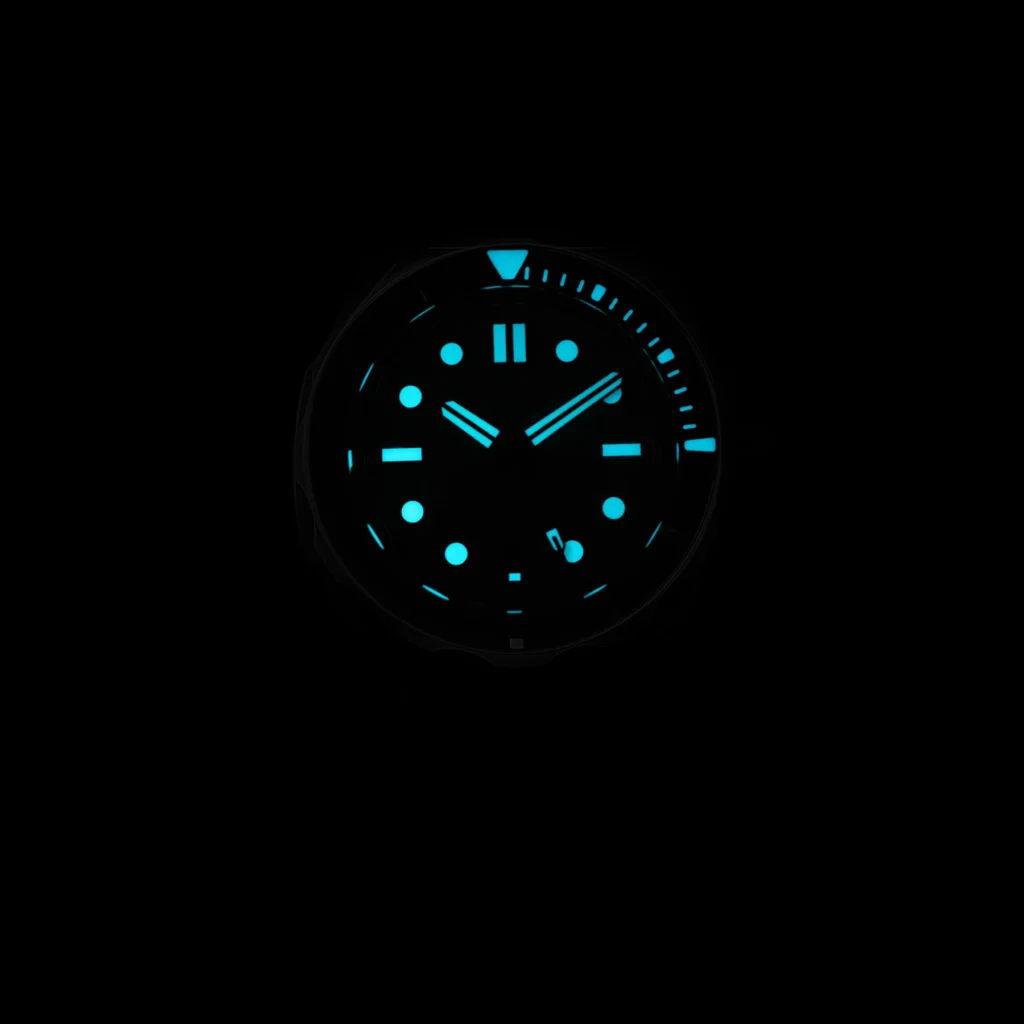 The dial features a captivating matte textured ‘moon face’ finish, adding a unique visual depth. Legibility, crucial for any dive watch, is absolutely top-notch thanks to copious amounts of BGW9 Swiss Super-LumiNova® on the hands and hour markers, glowing with a powerful blue luminescence in low light conditions – perfect for the black abyss it’s named after. Protecting this impressive dial is a double dome sapphire crystal with inner side AR-coating, providing crystal-clear views and excellent scratch resistance.