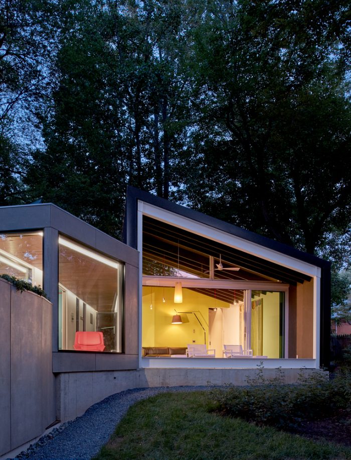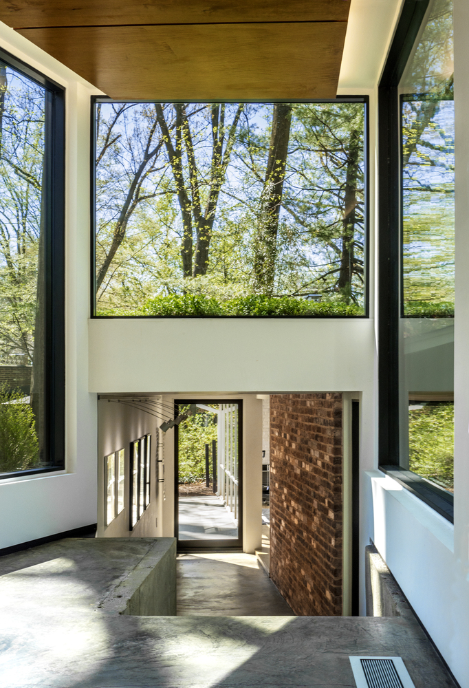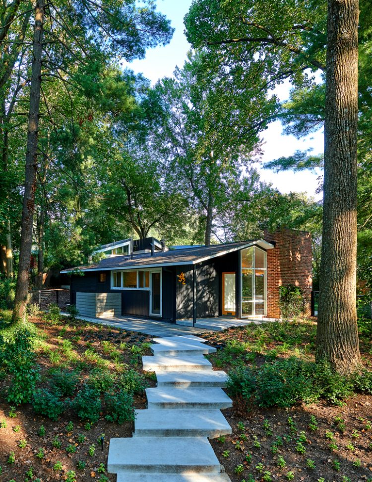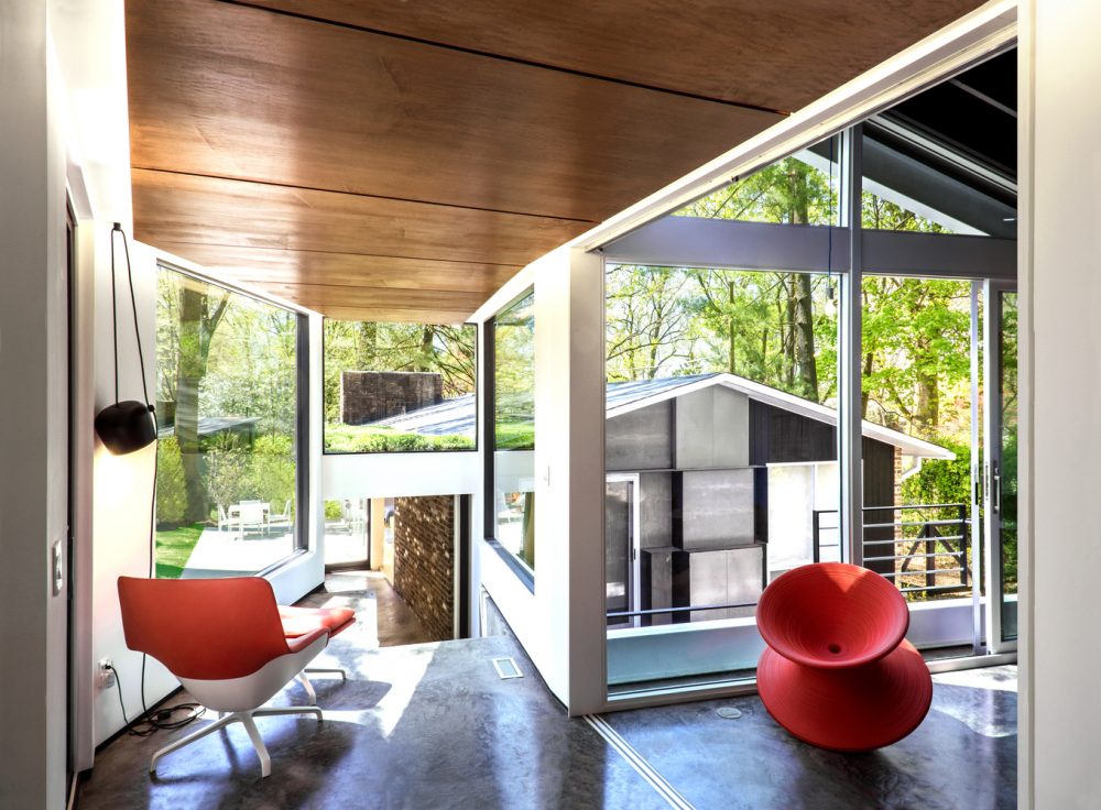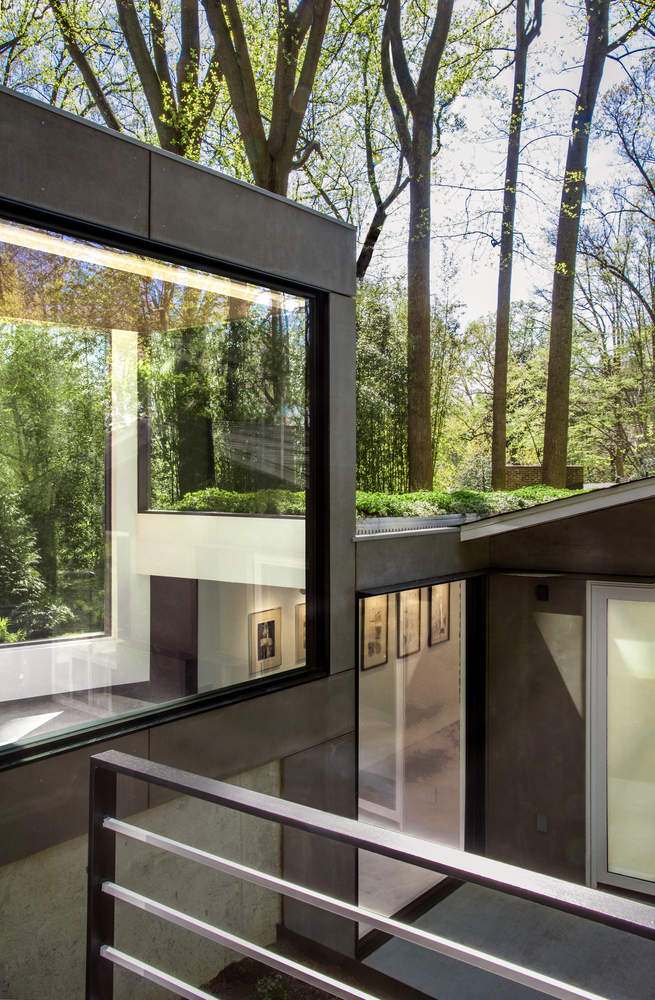 Environmental considerations are at the forefront with the Dual Modern House and it has a green roof on the connecting walkway which acts as a focal point from the new addition while collecting water runoff from the existing house roof. It has a small basement accessed from an outdoor stairway which contains all mechanical equipment and the electrical panel. Ductwork runs underground to the new concrete floors, providing a highly efficient air supply system. Metal roofing wraps down the sidewalls of the new structure, draining water to linear gravel troughs along the perimeter – so no downspouts or gutters are required.