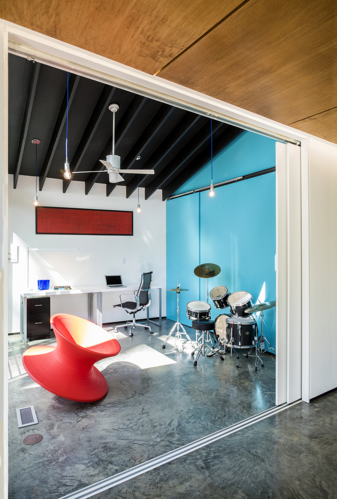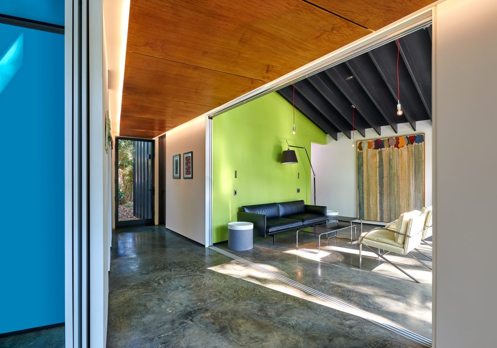 The rear addition to the Dual Modern House was recently finished and boasts a cool new den, office, and kids’ hangout space, with two new full bathrooms and a laundry room. Flexibility and versatility was an important factor and was designed into the layout of the property, with flow between spaces and sliding walls that allow for a future change of use. The separate entrance allows for the possibility of an accessory dwelling unit, or in-law suite.