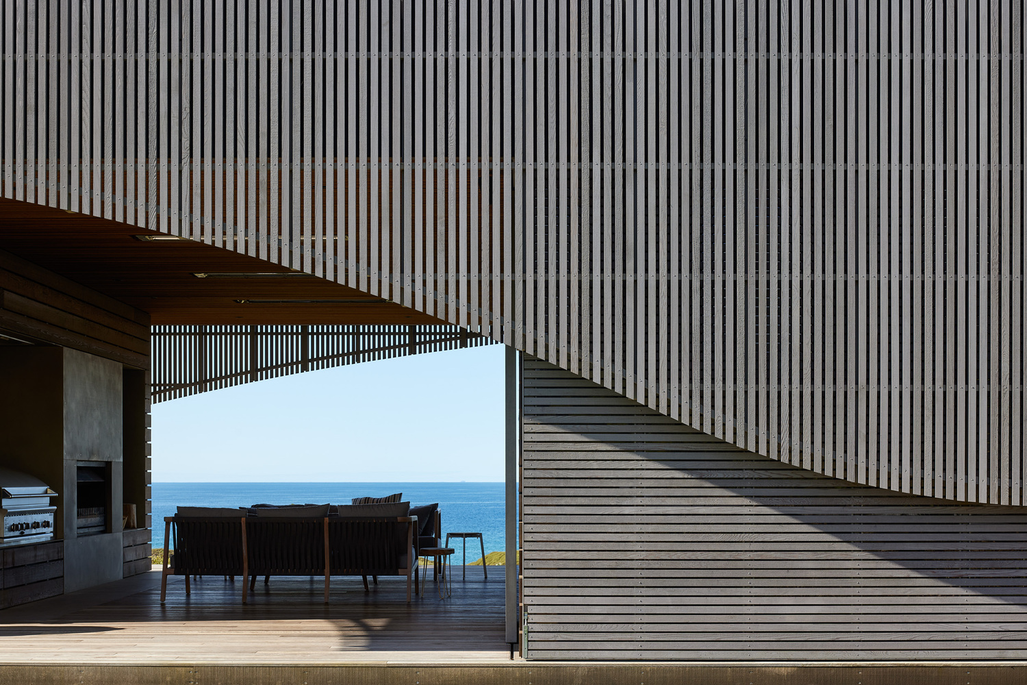 Boasting a simple rectilinear form that is sheathed in a light rain screen of timber battens, the top edge of this screen is sharply cut to deliver a strong horizontal line reflecting the horizon and delineating the built form of Dune House. The underside of the screen is cut to soft curves which conceptually mirror the dunes that surround the home and soften the form of the landscape.