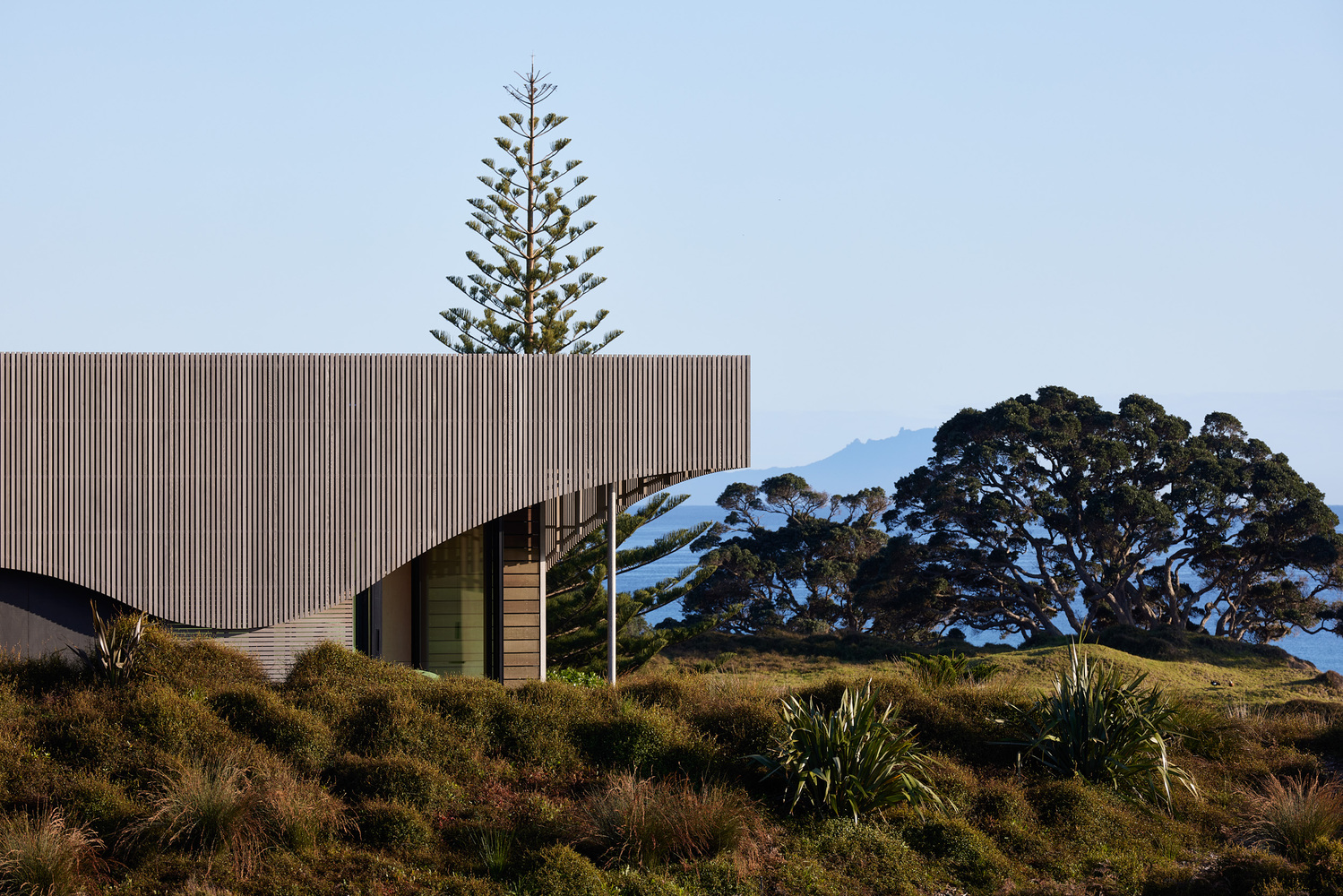 The plot on which Dune House is built is a large dune scape, carpeted with Muehlenbeckia, which undulates and rolls SW to NE down to a long East Coast beach. Planning restrictions stipulated a 200m setback from the high-water mark and the client’s brief for the build called for a main house with two bedrooms and two smaller sleepout structures. The architects have done a first-rate job of designing this beach-adjacent property.