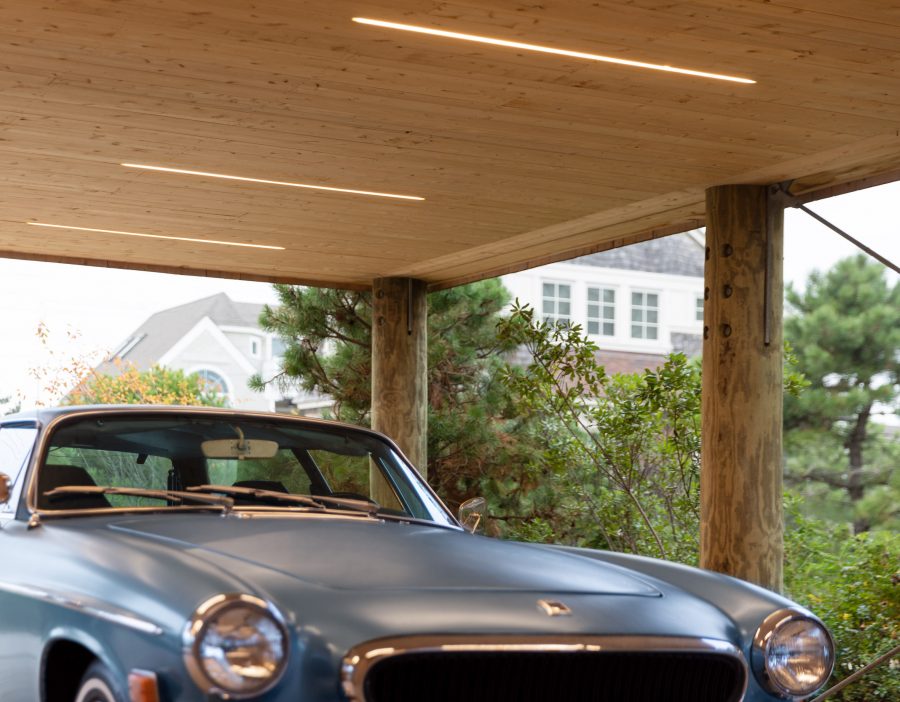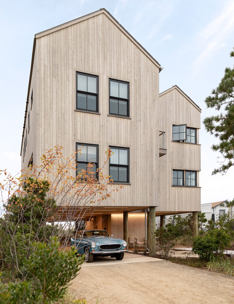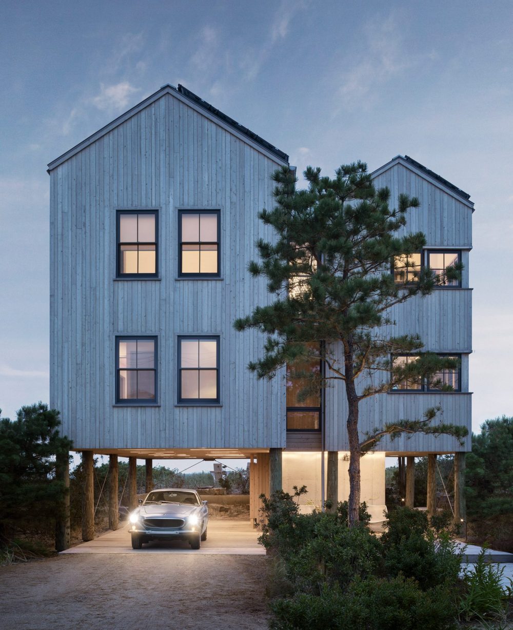 The In The Dunes House from Caleb Johnson Studio consists of two gabled forms of differing heights, which are joined together by a flat-roofed, central stairwell which are carefully designed to fit in with the lifestyle of the residents. As a result of the fact there is a potential of coastal flooding, the In The Dunes House sits atop wooden stilts and a concrete plinth. The open area at ground level serves as a carport for the owner’s impressive looking car.