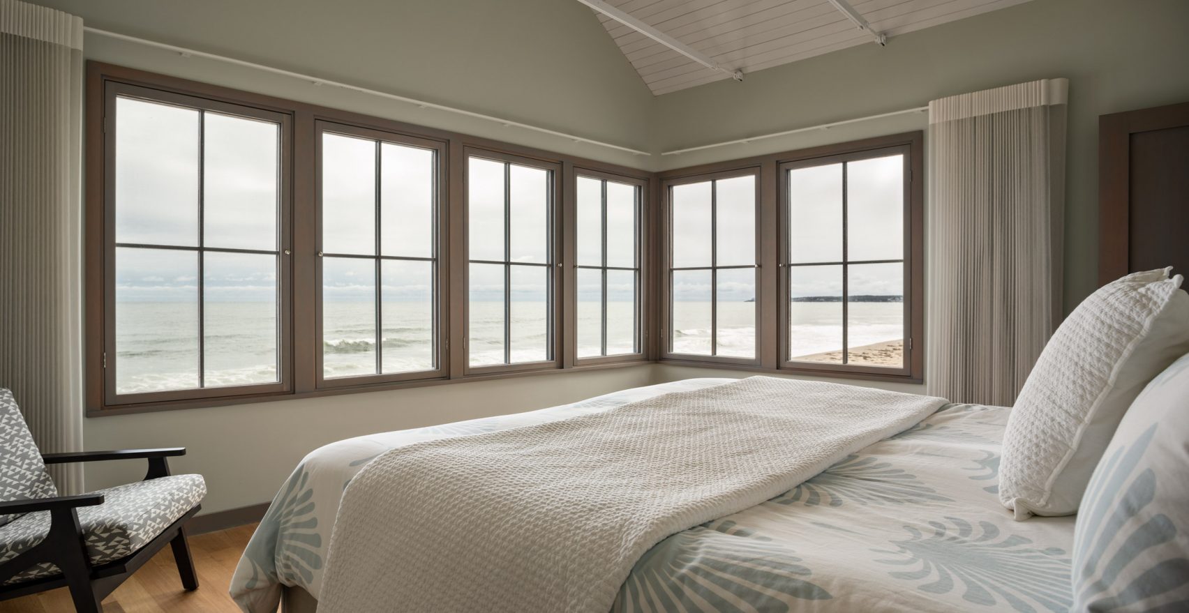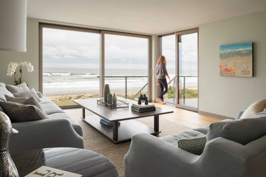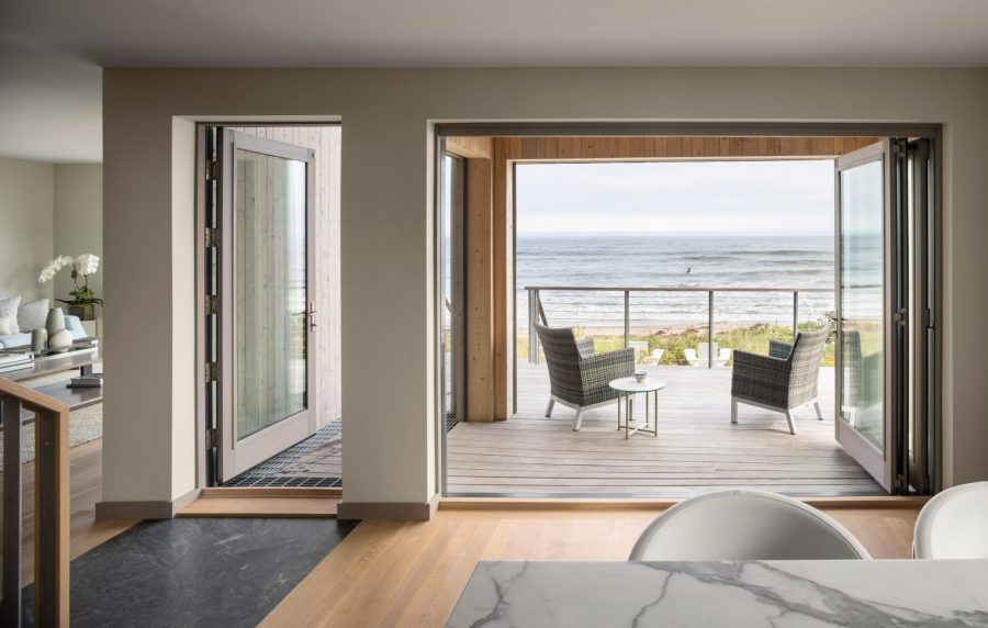 With the exterior walls of the house clad in cedar, there is a highly attractive aesthetic to this home which immediately draws the eye. The roof is sheathed in metal and both the cedar and metal materials are designed to weather over time and give the property more character the older it gets. The windows are framed with a dark metal that contrasts with the light-toned cladding and makes for a highly attractive structure that sits well within its coastal setting.