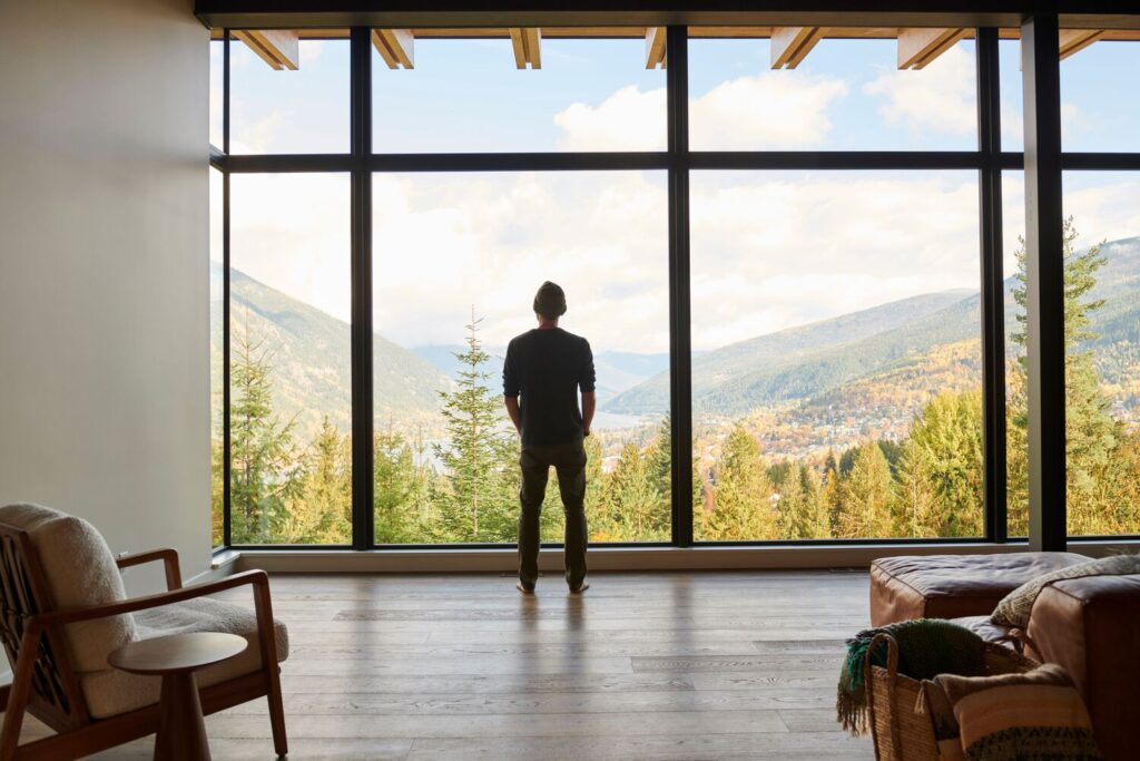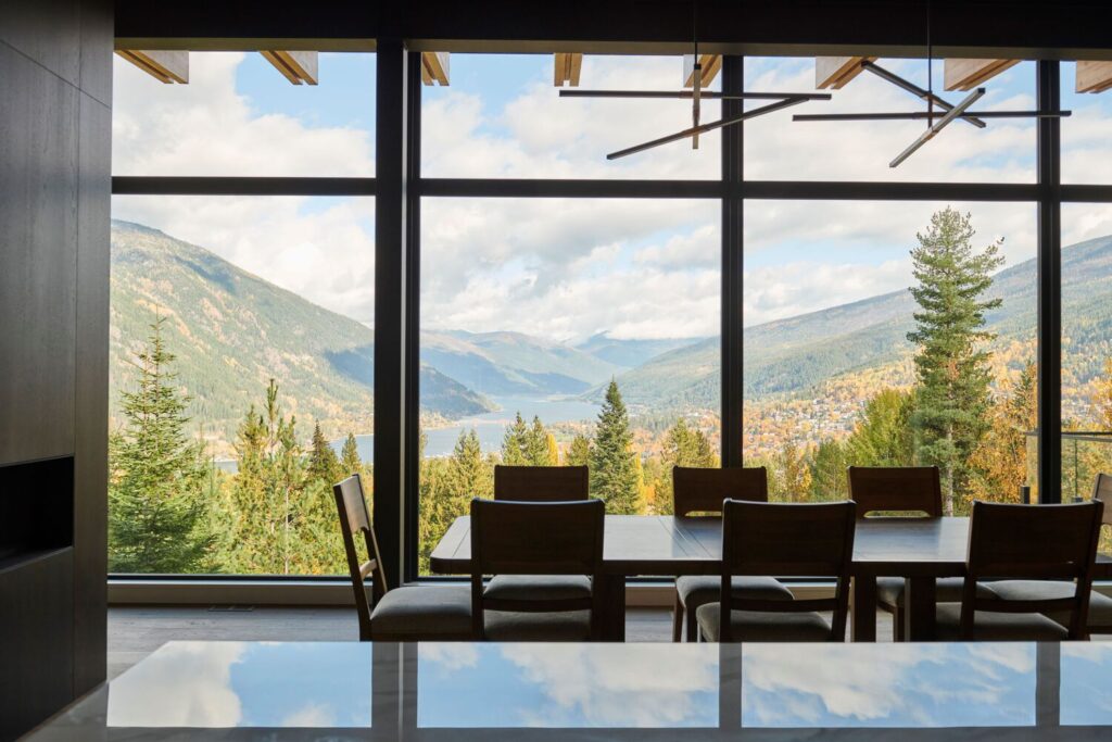 The journey to the house is as considered as the home itself. An access drive winds through a stand of conifers, leading to a footbridge that guides you towards a dramatic two-story glass entrance wall. Here, a solid Douglas fir pivot door swings open, and the first thing you see is a perfectly framed, deliberate view of Nelson’s iconic “Big Orange Bridge” with the breathtaking Kokanee Glacier forming the ultimate backdrop.