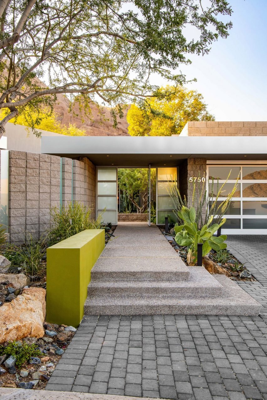 The external walls of Echo Canyon Residence from Kendle Design Collaborative consist of split-face concrete masonry units (CMUs), stucco and large swathes of glass that deliver an abundance of natural light into the wonderfully modern home in Arizona. With regard to composition and materiality, the property is intended to be a study in layering various opacities and it’s hard not to be impressed with the impactful aesthetic that the architects have achieved with this build. The entrance to the home is located on the north side of the plot, where the architect positioned a garage with glazed doors and a rounded, block wall.