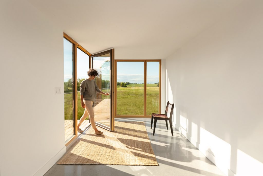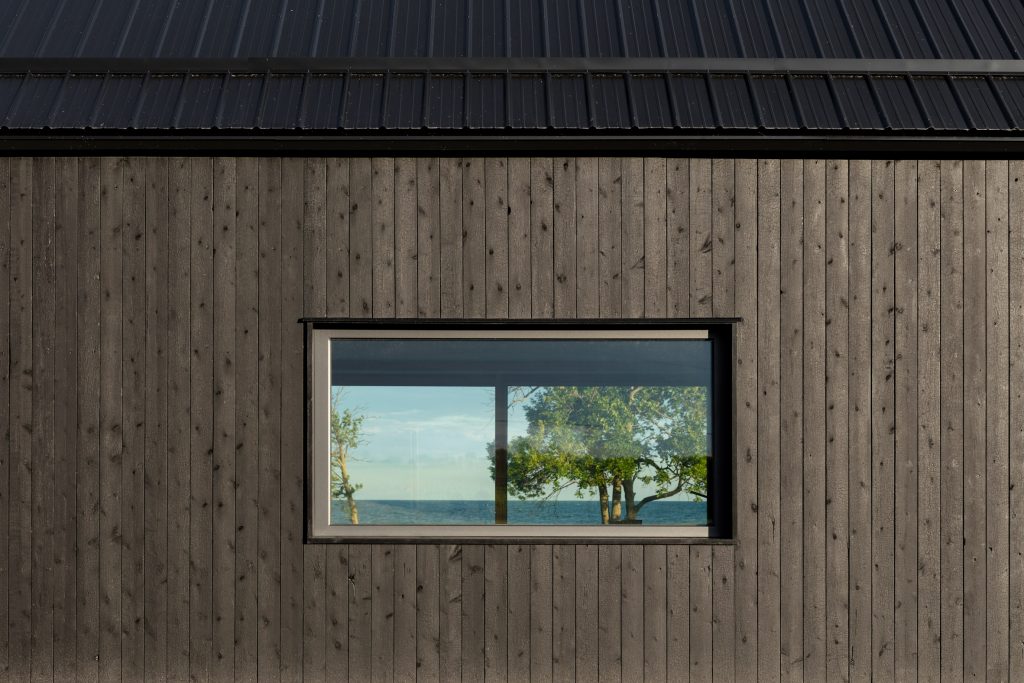 The cedar wood on the exterior of Ell House was charred by hand using the Japanese technique known as Yakisugi. This is a traditional timber-heating way of working that makes wood waterproof and pest-resistant – not to mention delivering a thoroughly eye-catching visual impact. The exterior of this holiday home in Canada provides a monochromatic aesthetic which accentuates the bold contrast between the house and landscape that surrounds it.