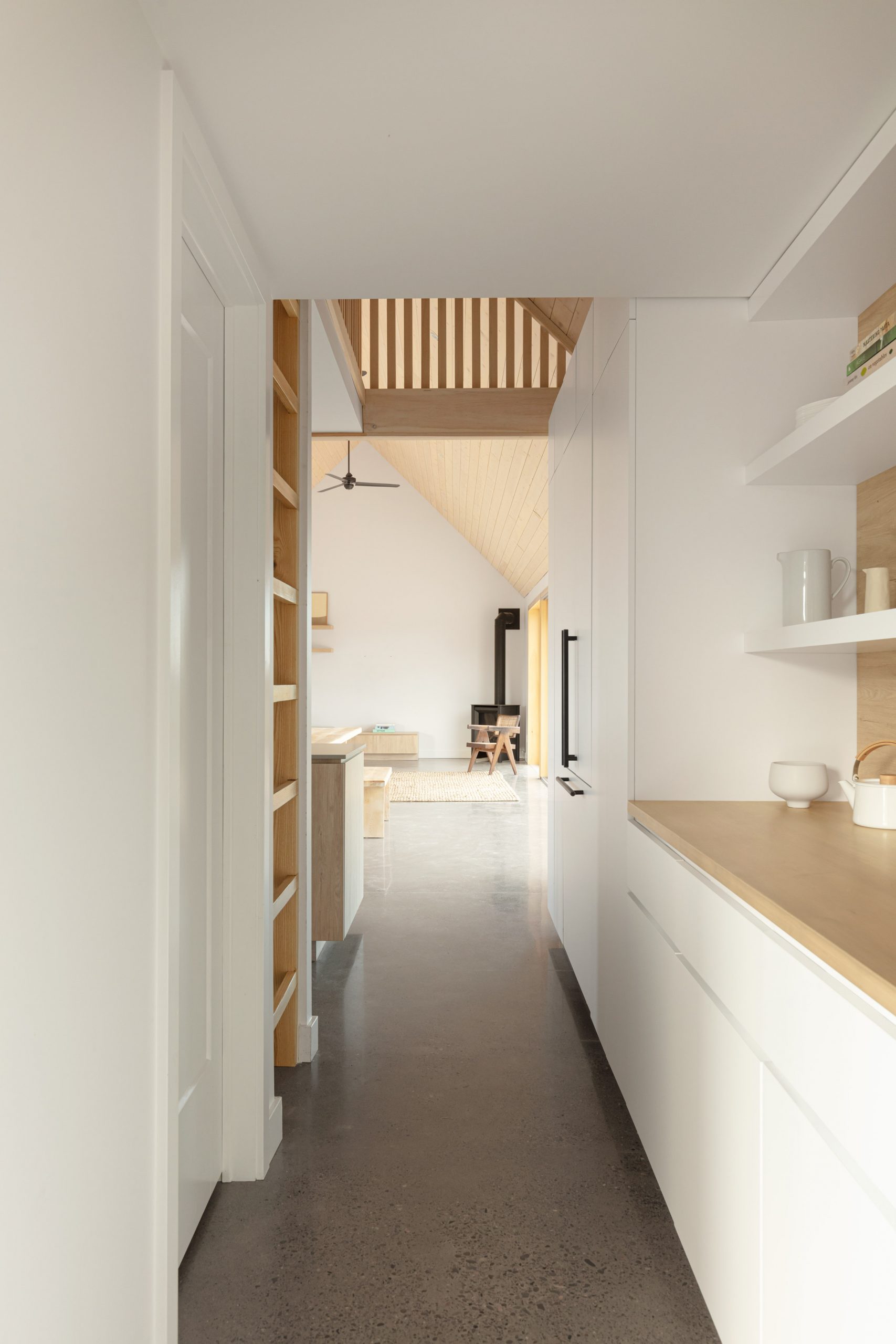 The two wings of this glorious looking holiday home are divided into a private area with two bedrooms and bathrooms, and a separate communal area that combines an open-plan kitchen with living and dining spaces. In direct contrast to Ell House’s stealthy exterior, its interior areas offer a much more muted palette of light oak millwork, white cabinetry and white-washed pine ceilings.