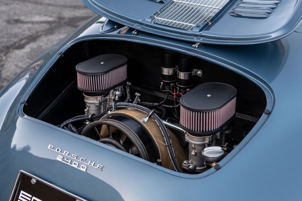 The Emory Motorsports 1959 Aquamarine Transitional Speedster is significantly more powerful than its original 1600cc forbears. The proprietary Emory-Rothsport Outlaw-4 engine, which was co-developed with former Porsche GT racing crew chief Jeff Gamroth of Rothsport Racing, is standard equipment. This 4-cylinder, 2.4-liter displacement engine, fed by Weber 48 IDA carbs, delivers 205 horsepower. Spark is issued via an MSD ignition box through a bespoke twin-plug distributor, while the dry-sump engine is cooled in part by 14 quarts of oil in a 911-style full-flow arrangement.