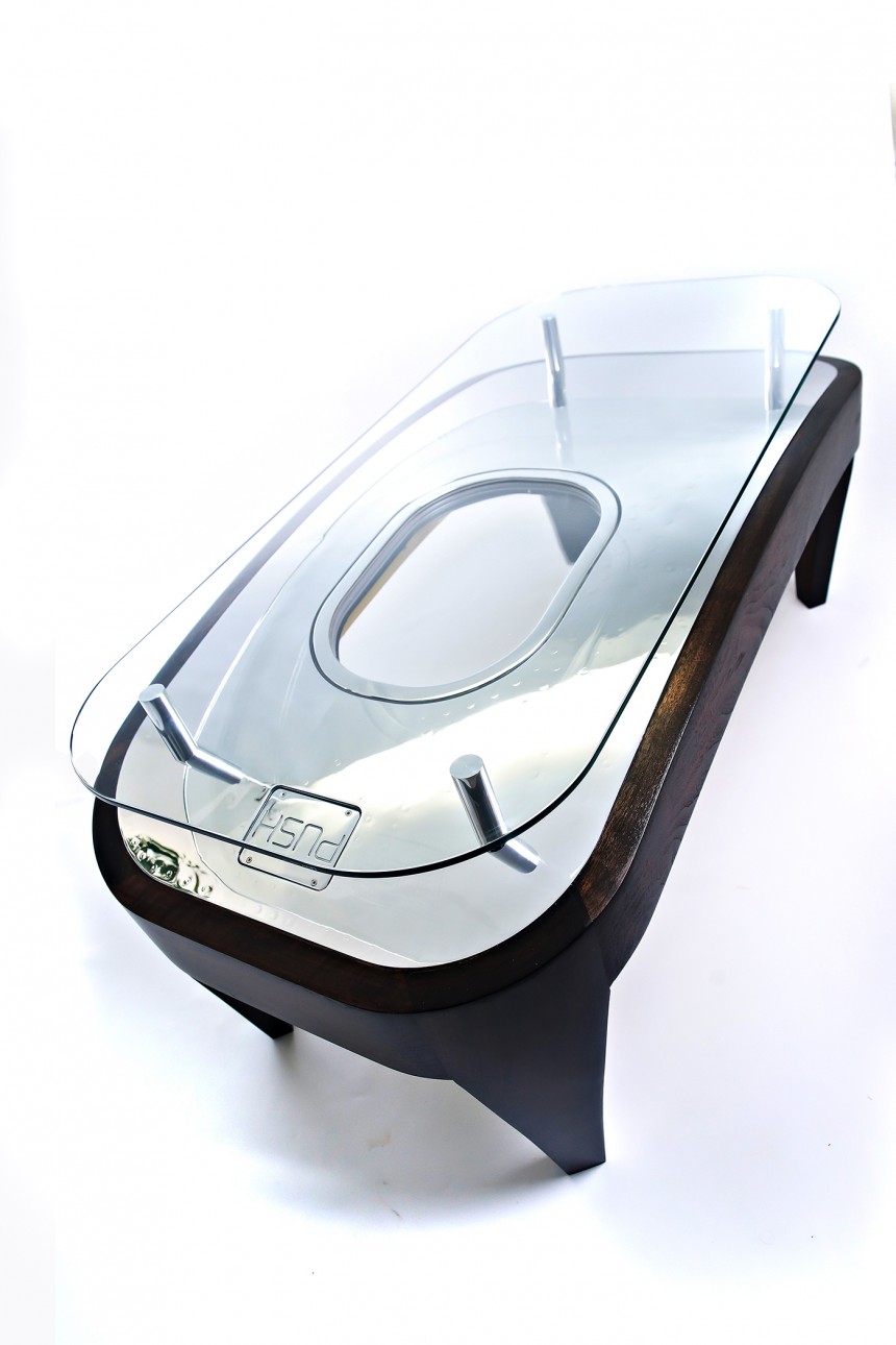 The Exit Table from Fallen Furniture is crafted from the escape hatch of an Airbus 320 and the aluminium exterior has been polished to a mirror-finish for a visual impact that is quite beyond compare and which provides support to the robust and strengthened glass top.