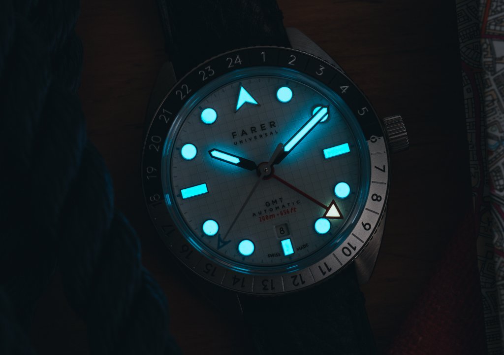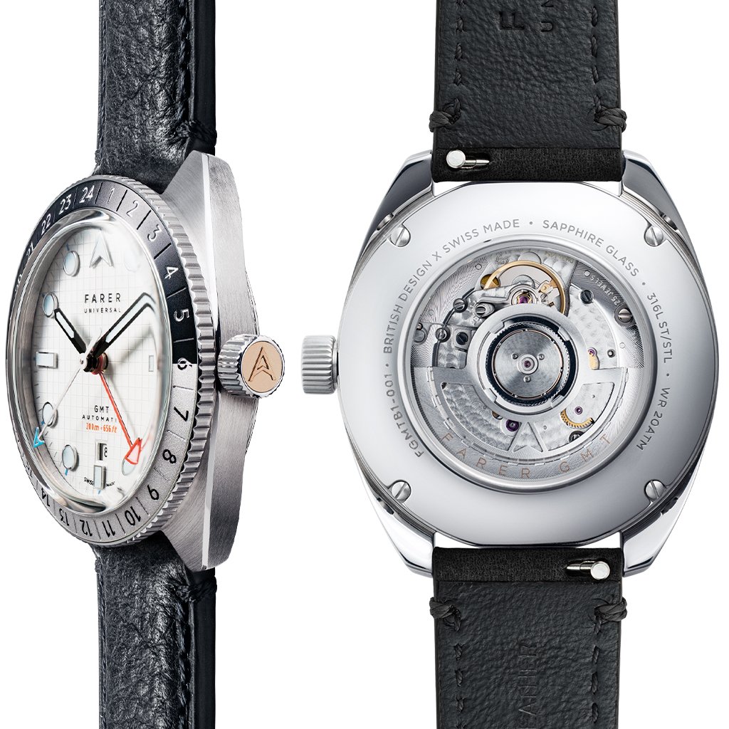 The ‘local’ hour/minute hands work on 12-hour time, while the ‘dual time’ GMT hand is independently adjustable to set to any 24-hour time zone and read against the bezel. The outer hour bezel can also be used to keep track of a third time zone. Turn the bezel until the new time zone is aligned with the GMT hand and to revert to the second time zone turn the bezel until ‘24’ is aligned with the Farer arrow. The date change is linked to the traditional hour hand (local time).