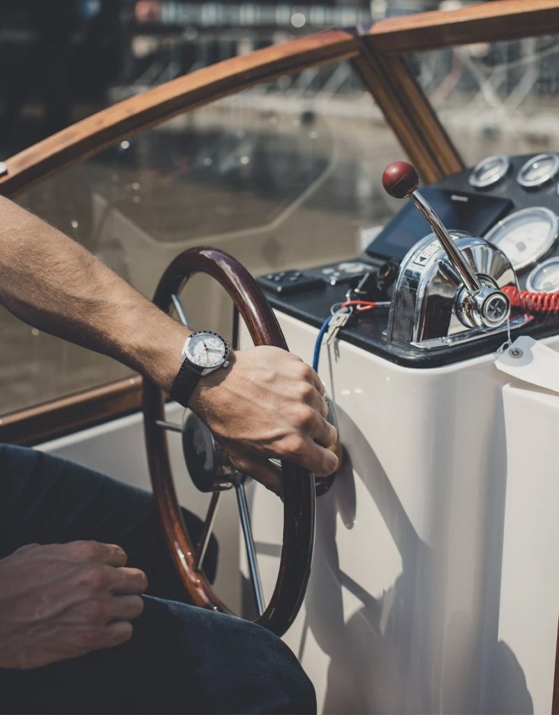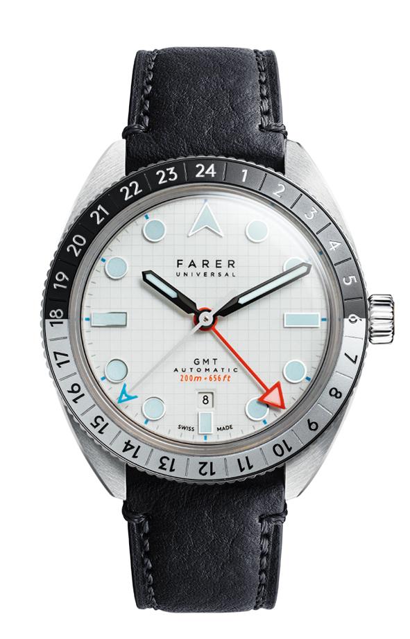 The unique pure white ‘swimming pool tile’ dial of the Farer Maze GMT Watch (£1250) with raised highly polished markers in circular and rectangular shapes are cleverly designed for unbeatable readability with the Farer arrow emblem clearly marking the 12 position on the dial. The external bi-directional, two-colour GMT bezel provides a reassuringly solid reaction to being adjusted with the 24 click rotation ratchet system. The bezel thickness especially has been expertly balanced so as not to overwhelm the timepiece when on wrist, making it easier to read while bringing an air of sophistication to the aesthetic.