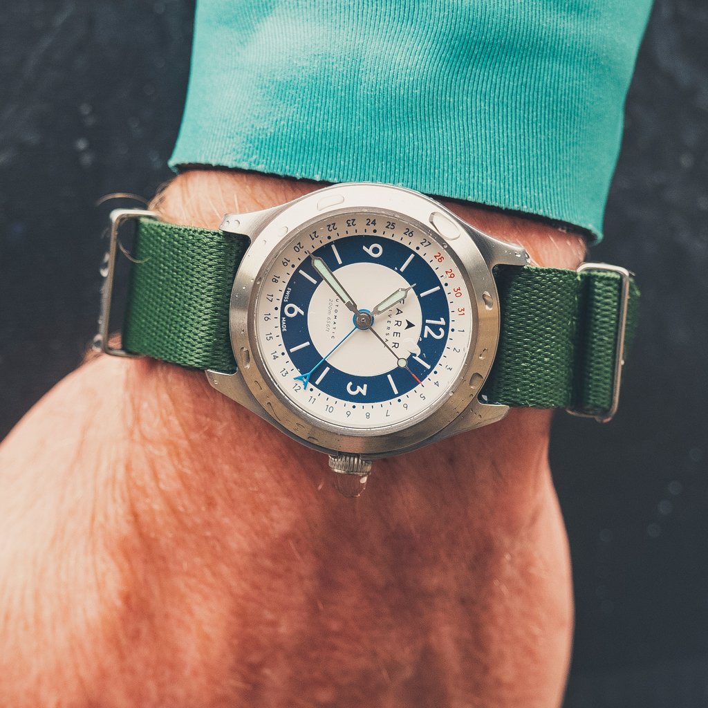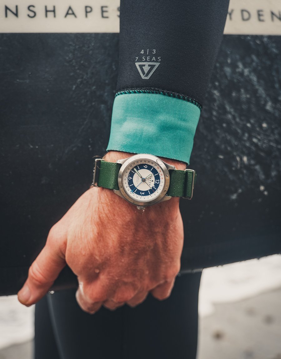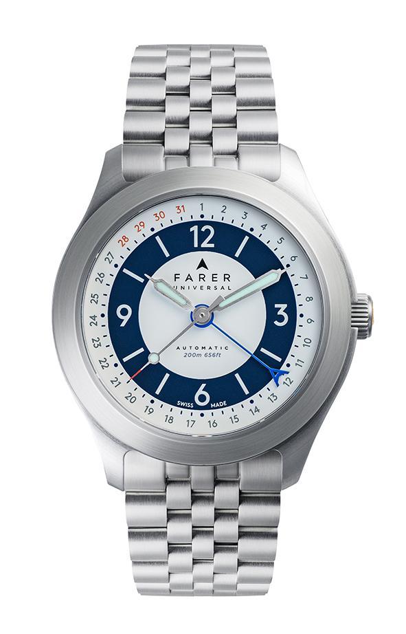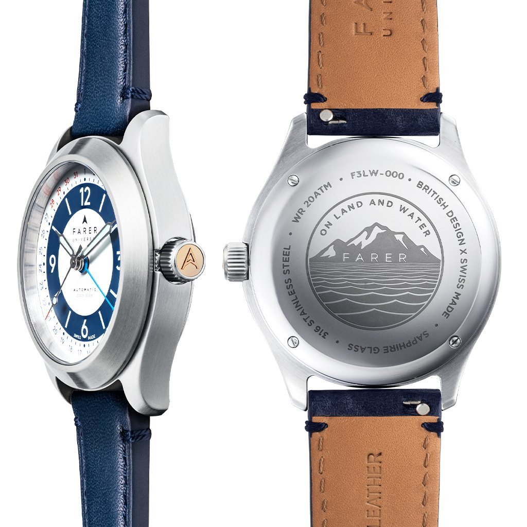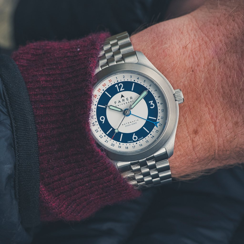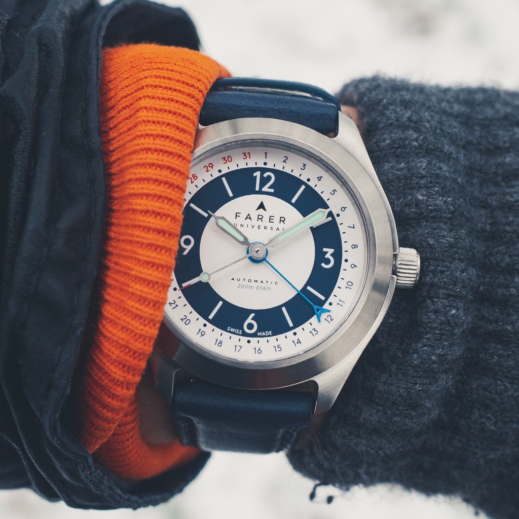 Sword style brushed steel hands are infilled in mint Super-LumiNova, giving the dial of the Farer Pembroke Field Watch (£875) a modern contrast. The airforce blue date pointer tip holds the Farer ‘A’ marque that highlights the date as it moves date by date around the outer ring, with month-end numbers in red to help remind you to reset the month with the quick date set function. A twist on a classic, that’s ready to wear no matter where you’re headed.