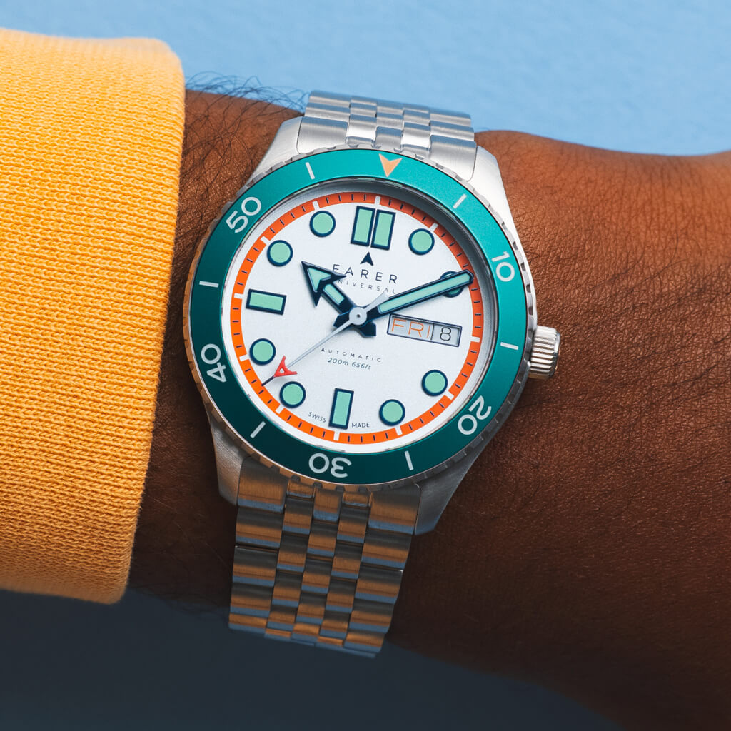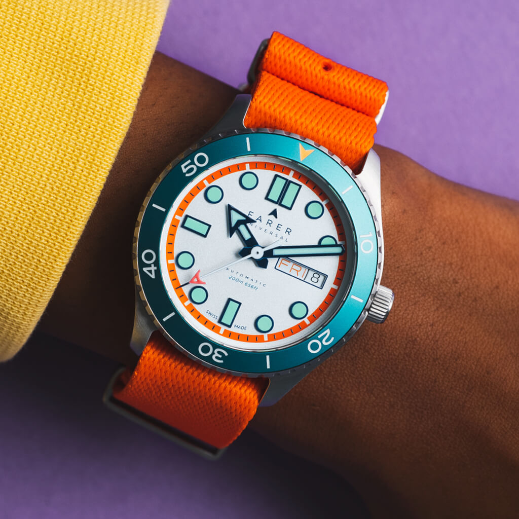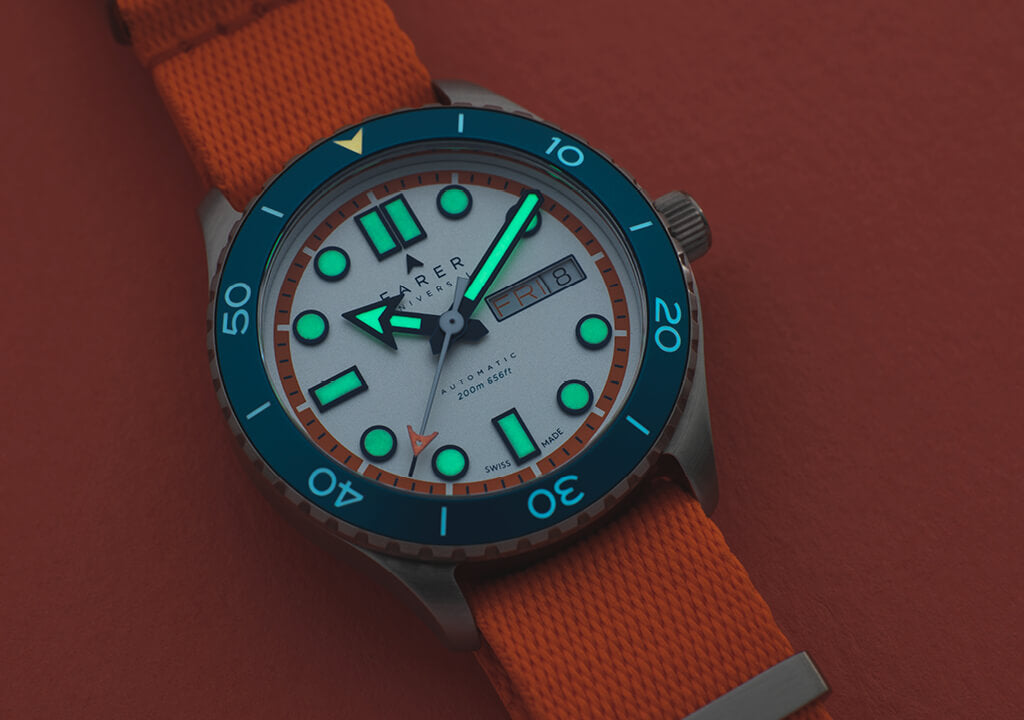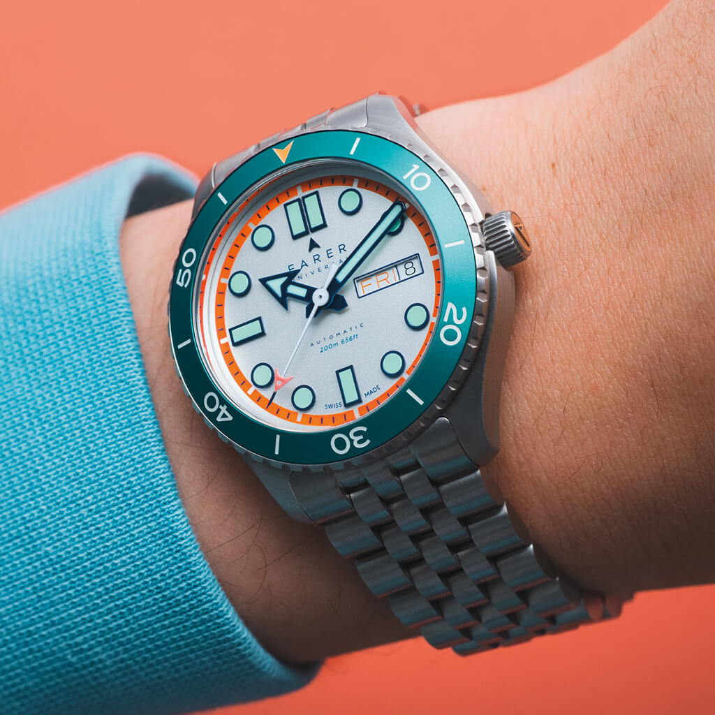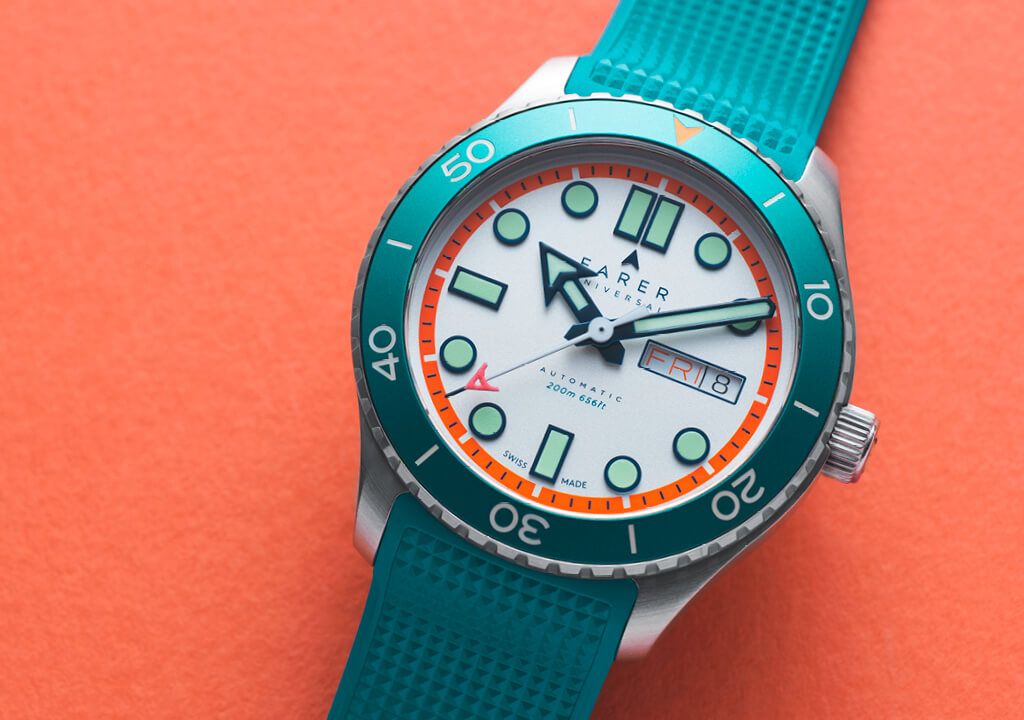 Priced at £895, the Farer Thurso Watch is excellent value for money and we’re big fans of the bold, vibrant visuals of this effortlessly classy timepiece. The retro colour palette has a splash of silver surf which covers the dial and this is framed by a burnt orange minute track and bold dot and dash markers infilled with mint Super-LumiNova. Deep blue oversized arrow hour hand and minute pointer hand deliver a distinctive hierarchy, allowing for quick readings against the outer sports bezel.