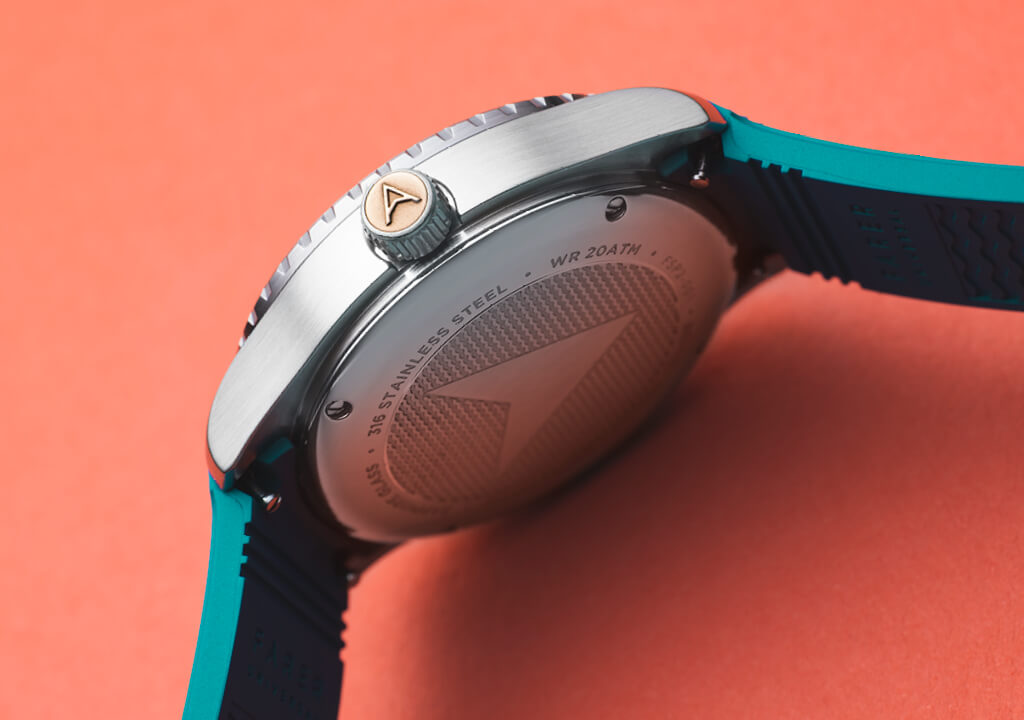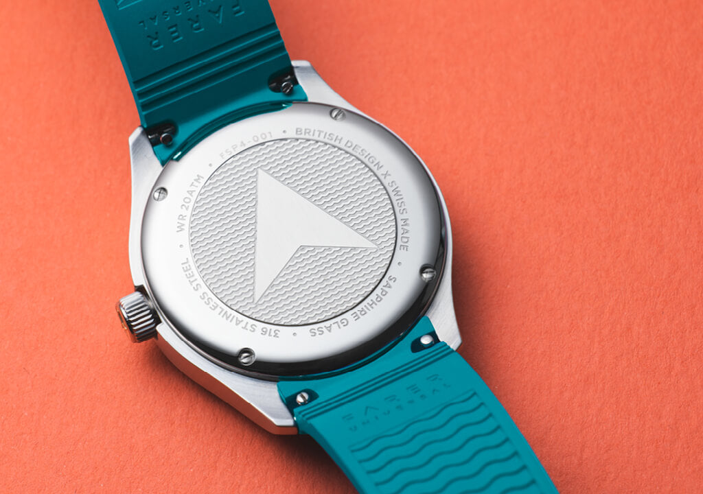 Finished off in impressive anodised teal aluminium and incased within a steel 120 click Swiss-made super smooth unidirectional system, there is an awful lot to appreciate with the Thurso – especially when you consider the sub-£1000 price tag. With day/date in classic English or French, this is a watch packed full of functionality and good times. The case is cut from a solid block of marine grade 316L Stainless Steel and the polished case back is decorated in an engraved Farer arrow marque and wave detail, which protects the Swiss-made Sellita SW220-1 movement and Incabloc Novodiac shock-absorber held within – reaching 41 hours power reserve when fully wound.