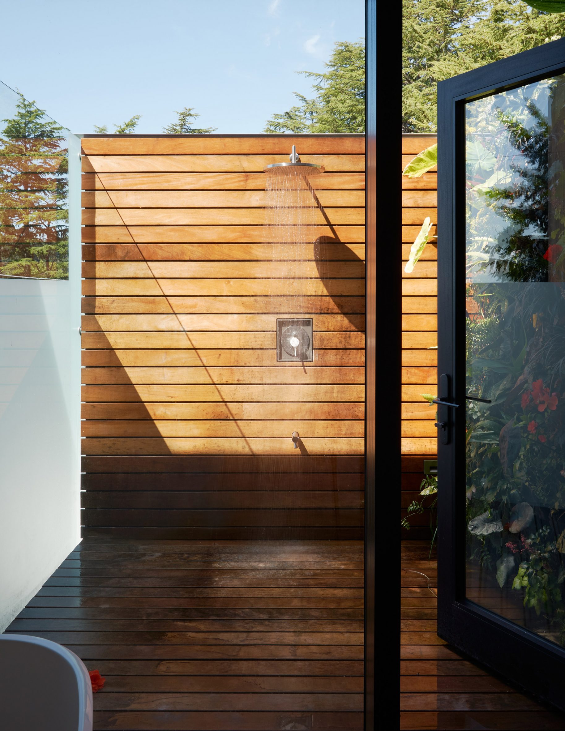 Most of the front yard is positioned behind a privacy fence. The parts of the house that are visible to the street are opaque, which makes sure there is privacy and reinforces the notion of the home being an oasis. On the upper level, a glazed box holds an outdoor shower and in lowest part of the home – which opens out toward the beach – you’ll find a media room, bar, wine cellar, yoga studio sauna and bathroom. This level also offers storage for paddle boards and a fire pit.