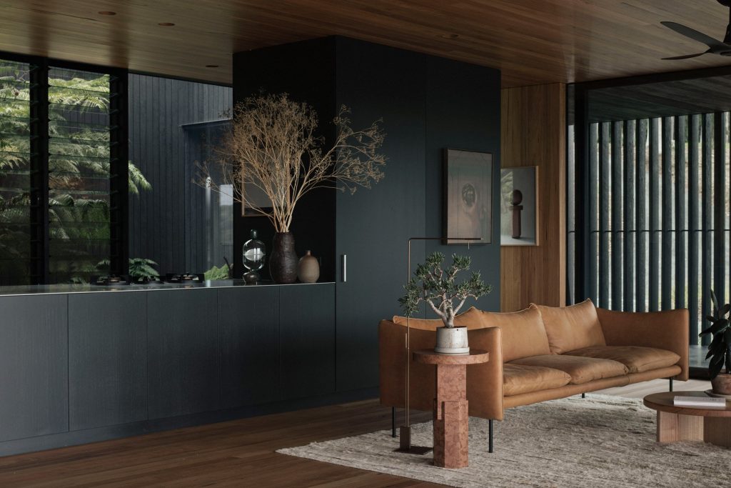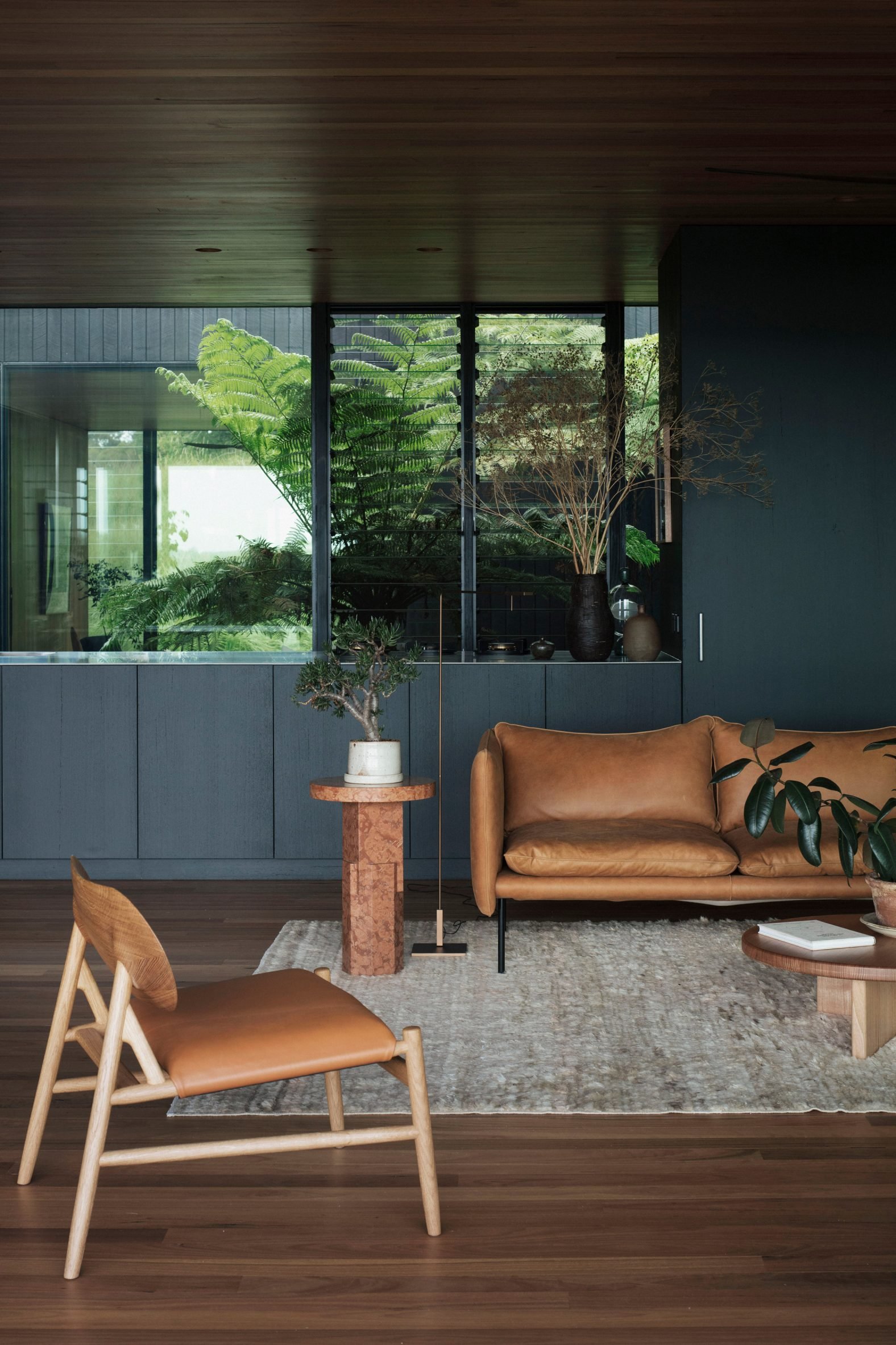 Sliding glass doors around the living spaces of Federal House from Edition Studio. and allow them to be completely opened to the elements on warm sunny days or sealed off from them when the weather takes a turn for the worse. At the centre of the home is a double-height garden void, which has been cleverly bought to life by a cut in the property’s roof. For the interiors of this stealthy, the dark wood and concrete are directly contrasted by lighter wooden floors and tan leather furniture alongside custom door pulls which have been implemented to provide a more tactile interaction with the house.