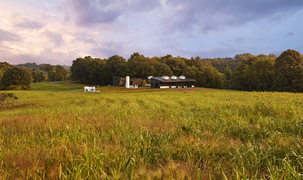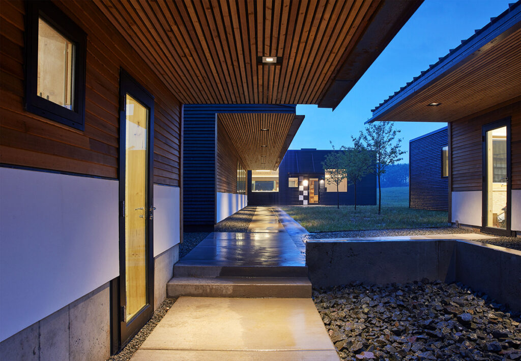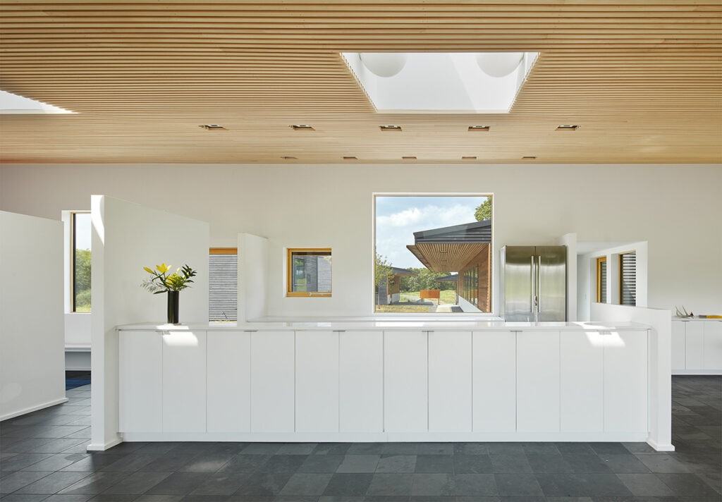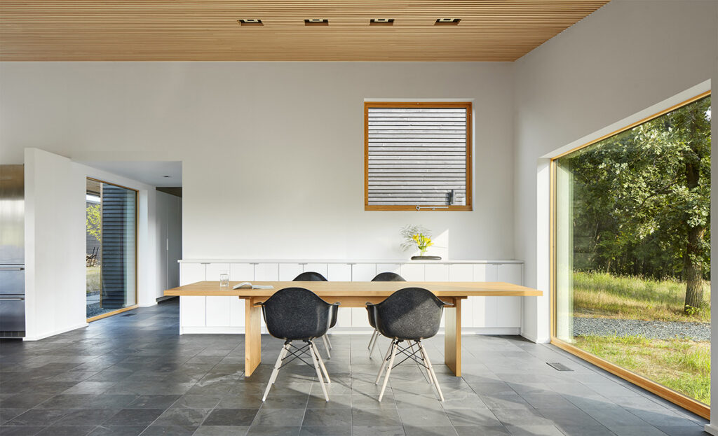 Each of the five building are positioned according to function, solar orientation and relationship to specific features of the landscape and the facades are clad in cedar, and roofs are covered with standing-seam metal. Some of the most striking of the interior finishes at Fifty Acre Wood House include slate tiles, quartz countertops and ceilings sheathed in pale-toned basswood. Throughout the home, the architects incorporated a number of design features to help reduce energy consumption. These include operable windows, a hydronic in-floor heating system, an air-to-air heat exchanger and a high level of insulation. A minimalist masterpiece.