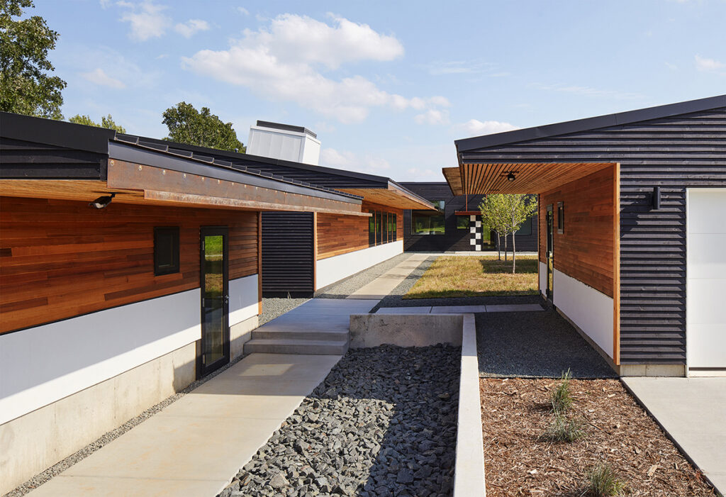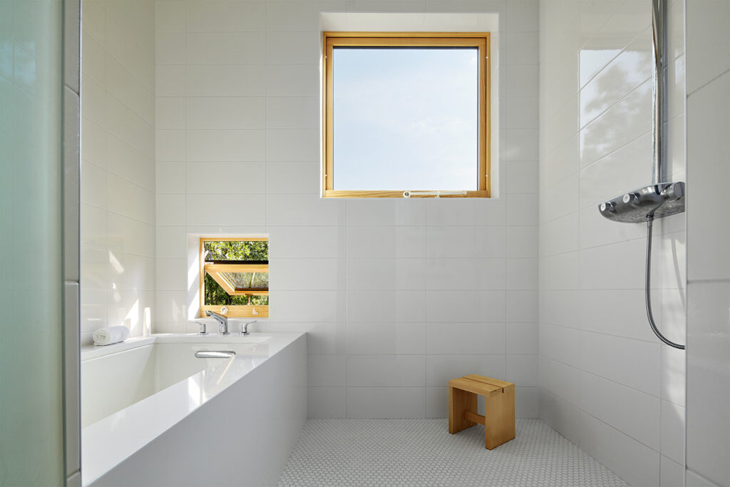 The architects came up with a selection of buildings for Fifty Acre Wood House that are organised around a central courtyard. The design takes inspiration from two primary references: namely, a cluster of shed-roof agricultural buildings and a Japanese courtyard house with sheltered, exterior walkways. The main part of the home comprises two pavilions that form an L-shape and are joined by a glazed passageway. Close to this you’ll find a detached guesthouse, a garage and a multipurpose building.