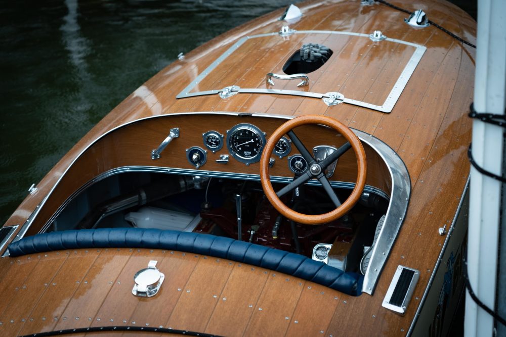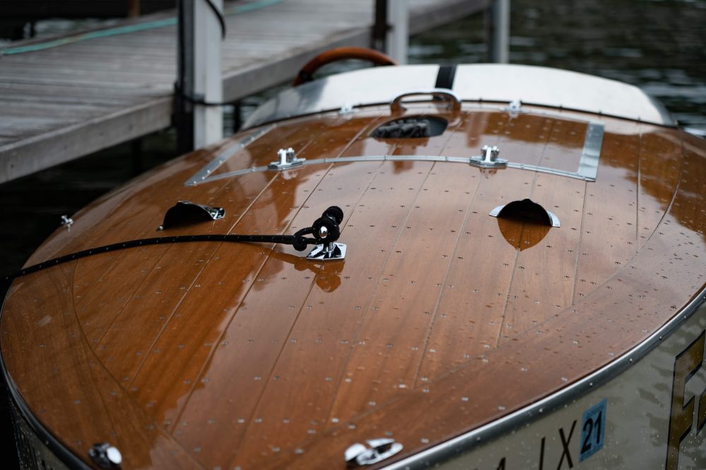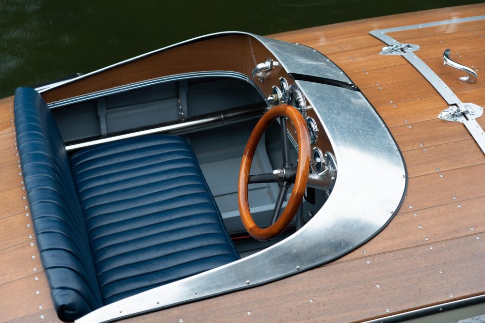 Everywhere you look with the BugBite Wooden Boat from Kevin Fitzke and A.A Apel there are impressive features and this includes structural fasteners which are marine grade silicon bronze and chrome plated brass. Kevin Fitzke is responsible for hand crafting all wood work, paint, varnishing, gold leafing/lettering, engine rebuilding, mechanical installations and hand forming the aluminum windshield, air scoop and various trim pieces. All hardware is either original 1930’s period or inspired by this time frame.