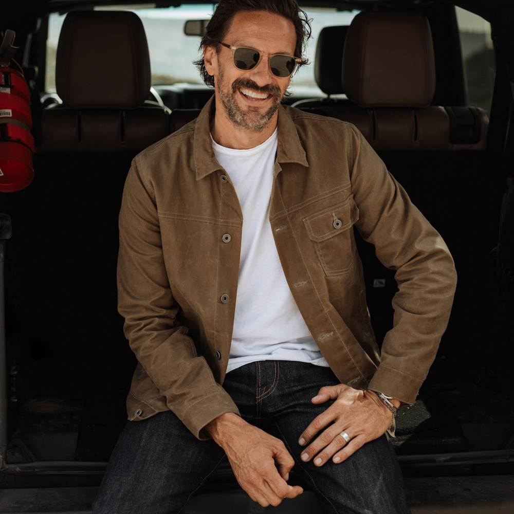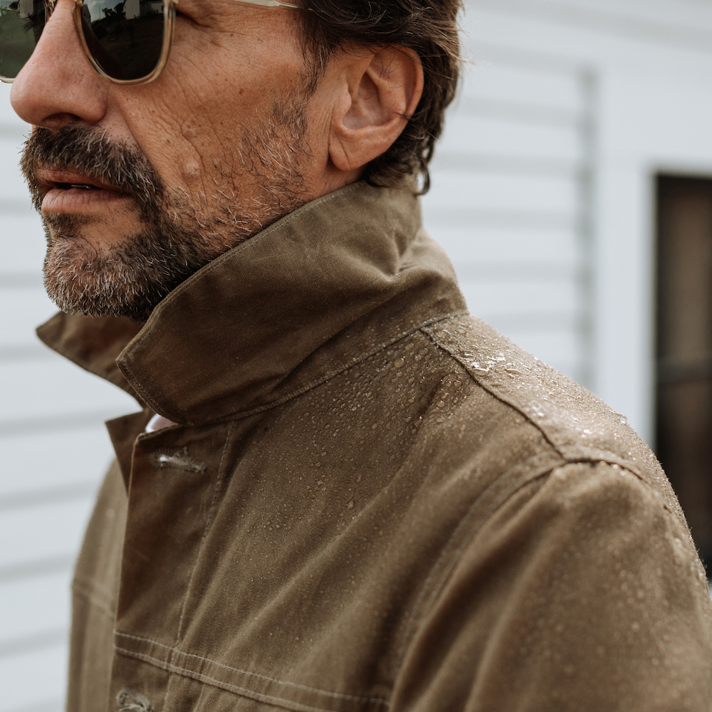 No nonsense, timeless, and made in the USA, this exemplary piece of outerwear is constructed with a waxed and weather-resistant Martexin 7 oz. sailcloth, which like selvedge denim or finely tanned leather, will only get better with age and the adventures that you take it on. Every time you hoist a beer, tie your boots or ride your bike, your movements will alter the colour of the waxed fabric in the creases and bends to come up with your own unique wear patterns.