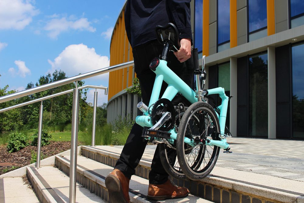 The FLIT-16 Folding Electric Bike on Kickstarter (£1500) can be folded up in just 10 seconds: with three simple steps to roll the bike, and a further step to complete the fold. FLIT’s unique folding mechanism enhances ride quality: unlike other folding bikes they’ve managed to keep the main frame hinge free to maximise the rigidity of the ride which delivers a more stable performance out on the open road. Weighing in at just 14kg, it’s easy to lift your ebike upstairs, or just stop, fold and roll straight onto the train.