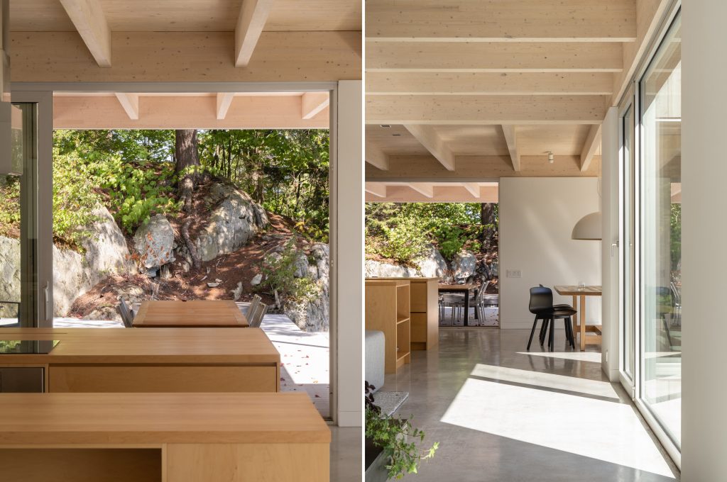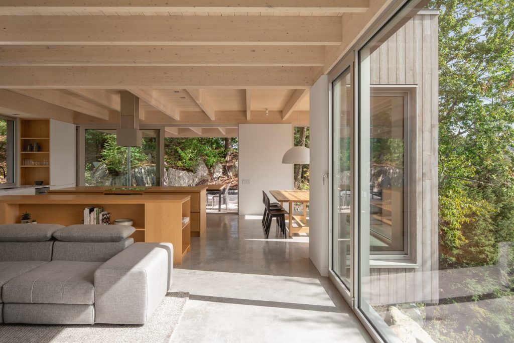 Bleached black spruce was utilised for the roof structure, whilst the exterior cladding consists of planks of greying white cedar, to which an ageing accelerator has been applied to speed up the finished aesthetic. On the inside, solid maple has been used for the kitchen counters as well as maple veneer, while all of the built-in furniture is made of Russian plywood. The shades of blond, bleached and greying wood, highlights the richness of the natural material, and blends into the discreet hues of the white painted gypsum, the grey concrete, and the natural aluminium of the windows.