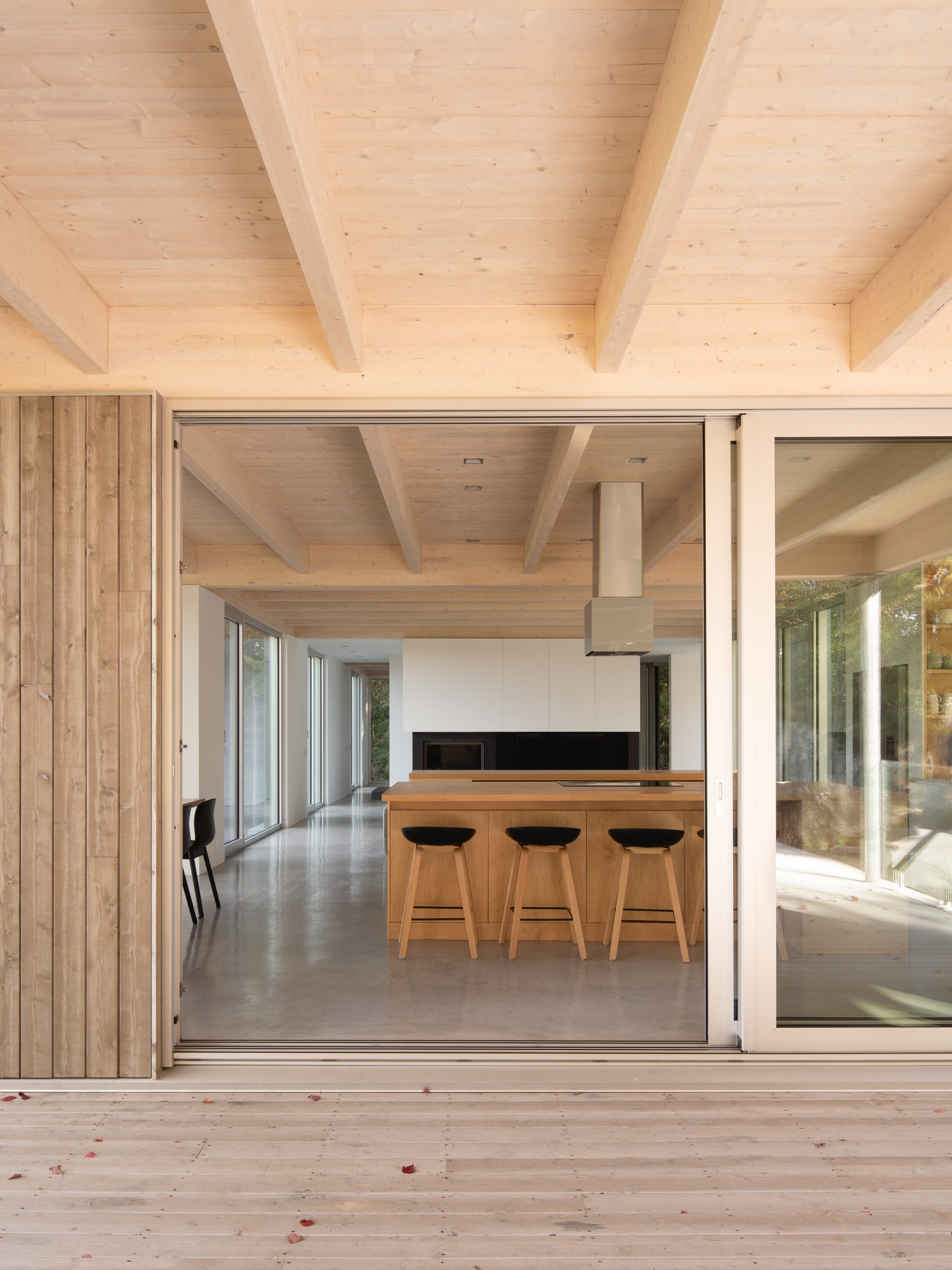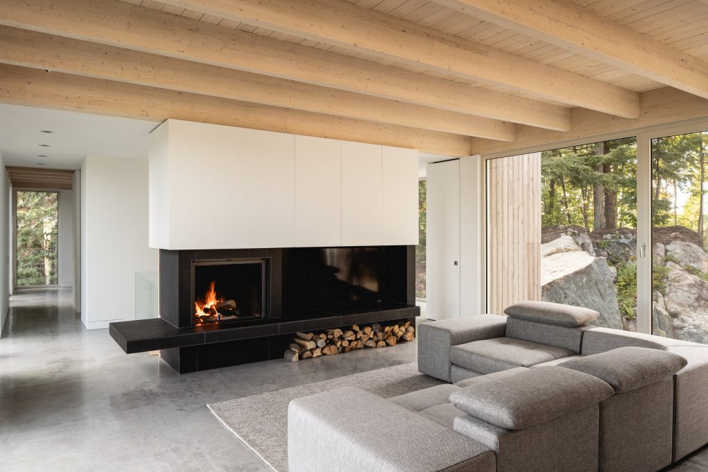 You’ll see that wood is to be found everywhere in this 215m2 house and this helps it to achieve total harmony with the forest. The roof structure, which has been left exposed, is crafted from engineered wood from northern Quebec. Particular care has been taken in the design and finish of these structural elements, which are staggered in regular spans 3.9m on each side.