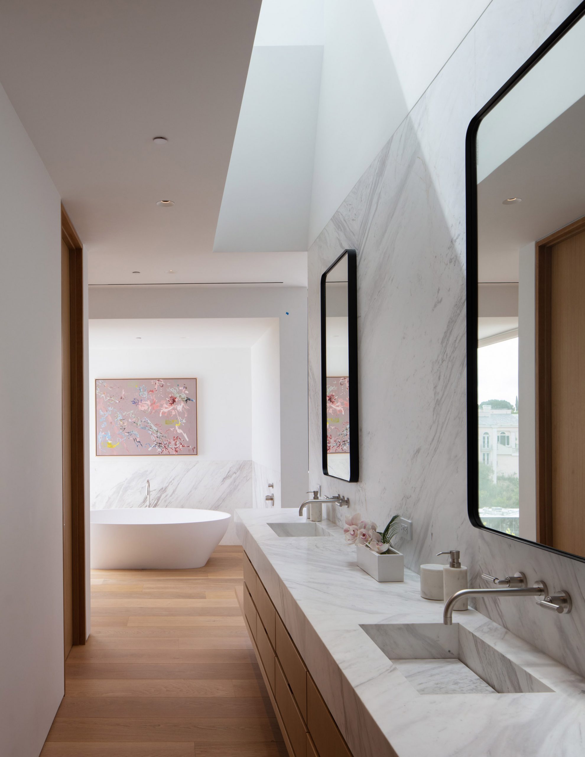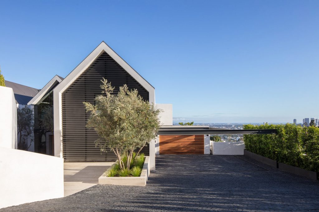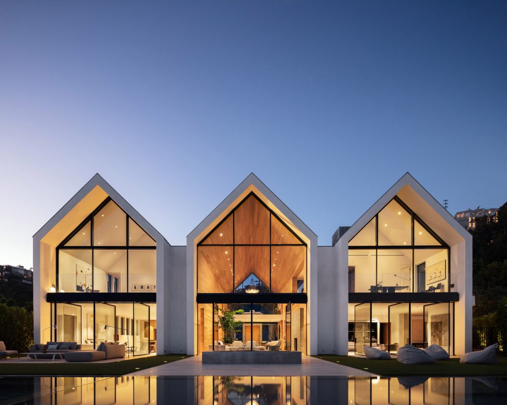Positioned on a one-acre (0.4 hectare) plot of land that features a promontory for expansive and unbeatable views over Los Angeles and the Sunset Strip, it’s hard to beat the luxury of Forest Knoll Drive House from Standard Architecture. Three, parallel white volumes are joined together with a trio of dark metal gabled roofs which are based upon the repetitive construction on the Kimbell Art Museum in Fort Worth, Texas, which was completed by Louis Kahn in 1972.