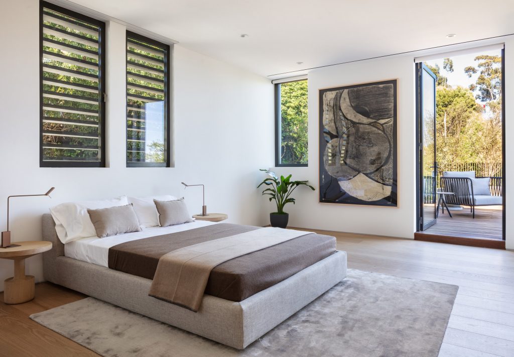 There is a pleasing understated and minimalistic aesthetic to Forest Knoll Drive House from Standard Architecture which is witnessed throughout the entire property. In the main living area, wood panelling extends from the ceiling to the walls and floors and the other sitting areas are incorporated onto the ground floor, as well as a home theatre room and a kitchen with grey counters.