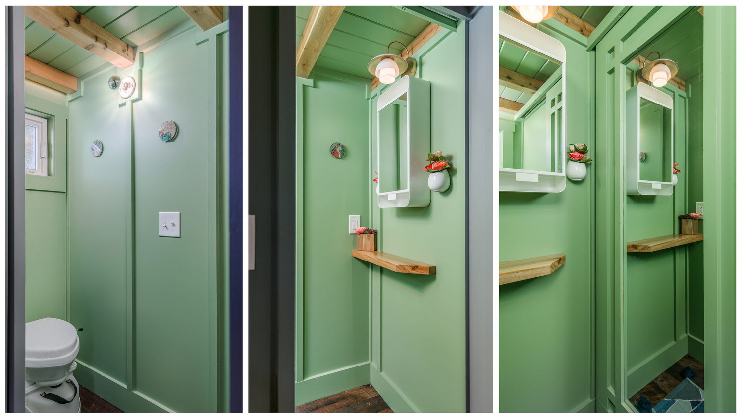 What Tiny Homes lack in size, they more than make up for in character and visual appeal and that’s very true of this Cornelia Tiny Home. With a fully stocked kitchen with a 33” Ariel® Stainless Steel farmhouse apron sink, 11 cu ft. Whirlpool® Stainless Steel Fridge, 30″ GE® Profile Built-in Induction Cooktop and Peacock Gold Granite Countertops, you can cook up a real storm inside this tiny home from New Frontier.