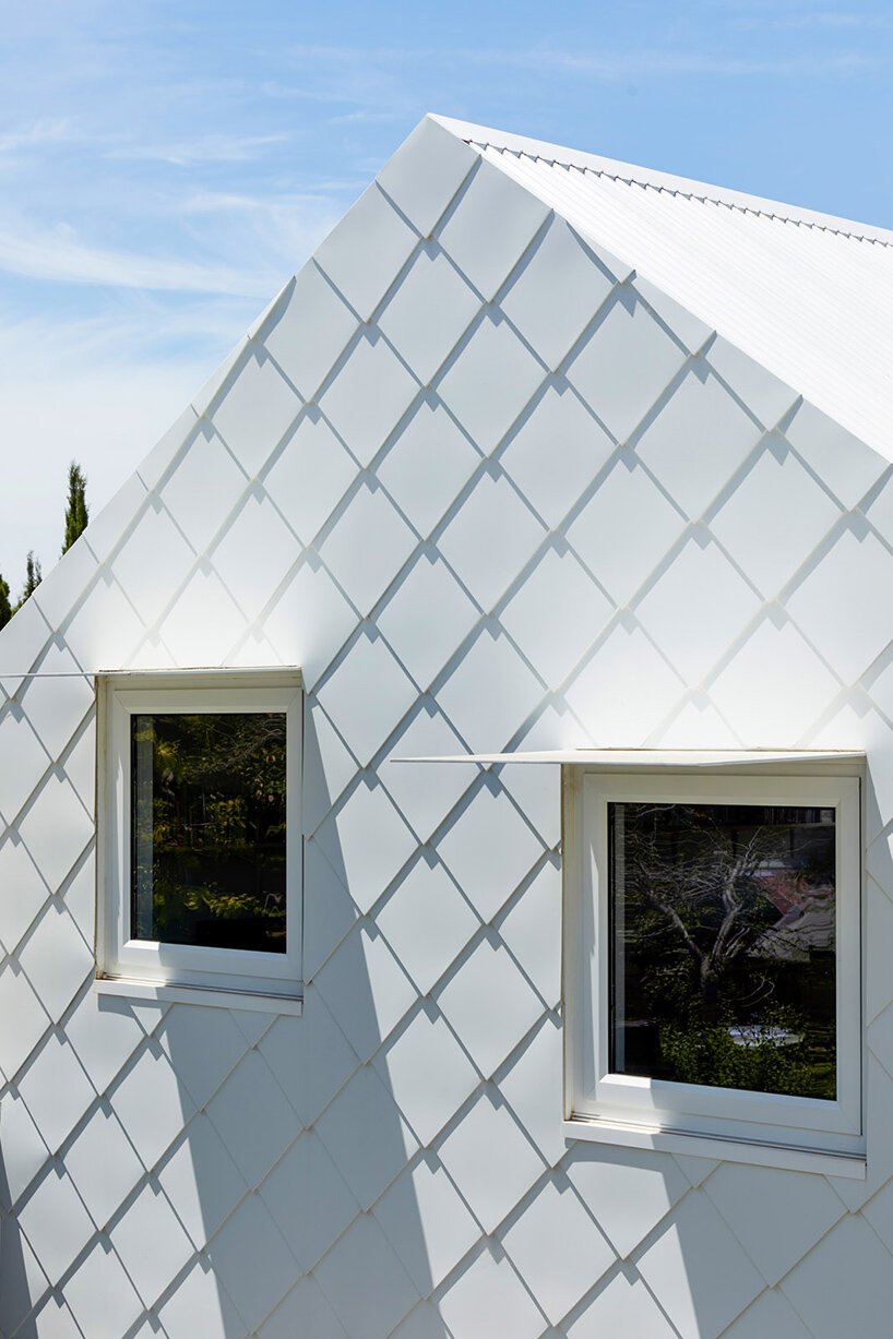 From the street the simple and domestic scale garage of Garden House from Austin Maynard initially appears to be the house in its entirety — a patterned, white shingled cottage with a expertly pitched roof. When entering the home, the interior reveals a much bigger space than you’d expect to see based upon how the property looks from the outside.