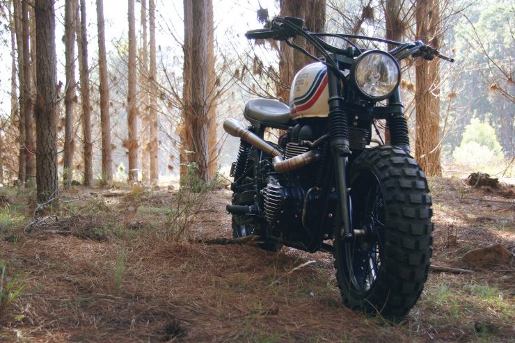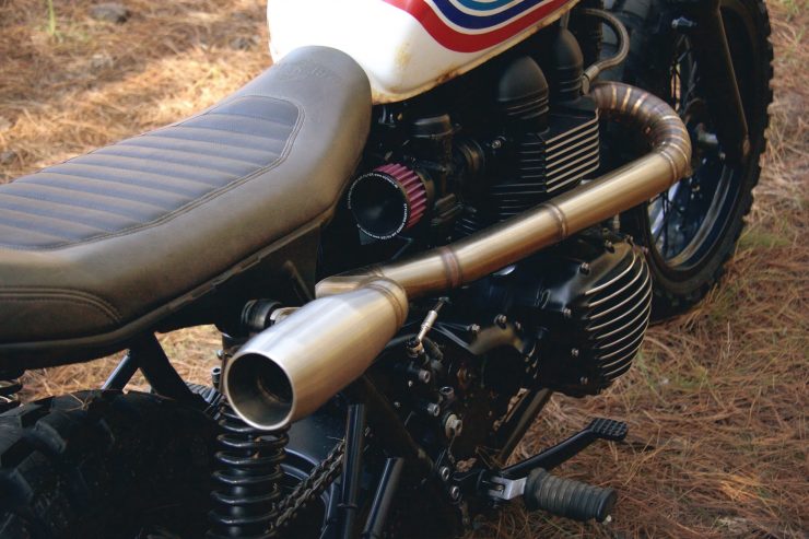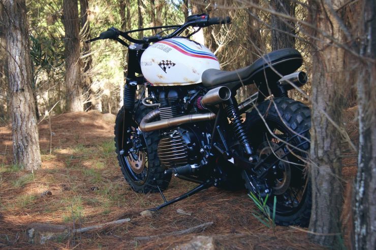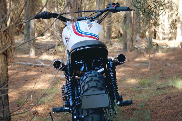 To achieve the great look and feel with this bike, the subframe was modified for the new seat and an LED taillight was added (with built-in indicators). In addition to this, wider rims were laced to the original hubs, before these were fitted with new chunky off-road tires, and the stock fenders to deliver a superior riding performance. New scrambler-height rear shocks were added to the machine to lift the tail a little and enhance ground clearance over the stock road shocks. There were also new off-road handlebars added, and twin high-performance exhausts, high-flow pod air filters, and a new lower profile headlight which was borrowed from a BMW bike.