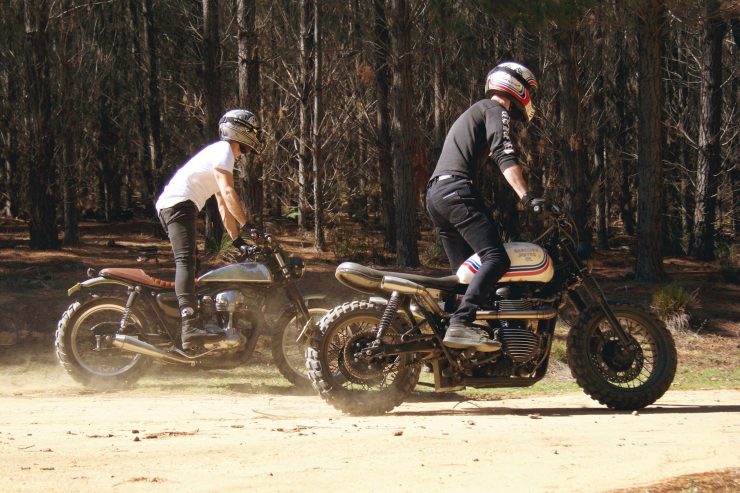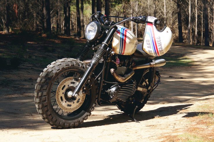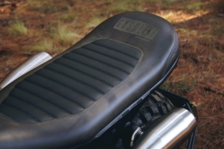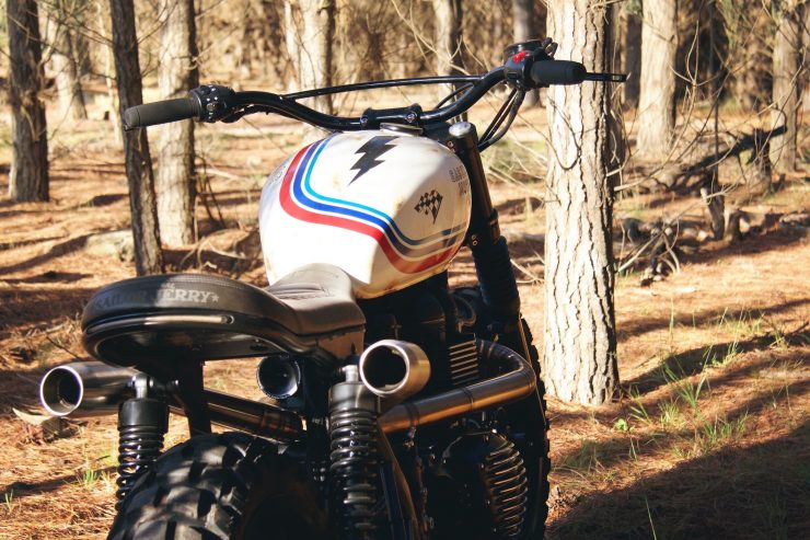 With a number of cleverly conceived design alterations, the stand out one with the Gasoline Motor Co x Sailor Jerry Custom Triumph Scrambler is the addition of twin high exhaust pipes down the side – which would have been a common sight on classic scramblers from the 1950s and ’60s – as it keeps them up and away from the terrain, which has the added incentive of keeping them dry when working your way across water.