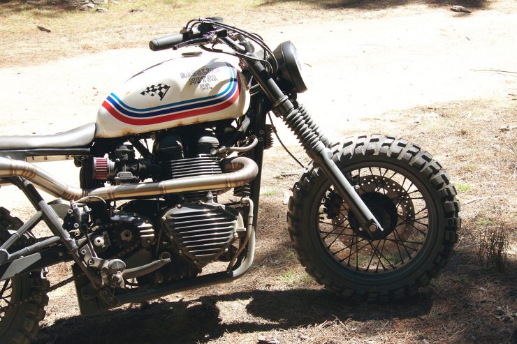 The Gasoline Motor Co x Sailor Jerry Custom Triumph Scrambler is also fitted with a 270° crank rather than the 360° crank which has helped shift torque down the rev range, and delivers more bottom end power albeit at the expense of some of the high end horsepower. This has been mitigated however, as Gasoline Motor Co quickly noticed they could get back this horsepower and gain quite a bit more with a few carburetor and exhaust upgrades so it boasts an unparalleled performance that has to be seen to be believed.