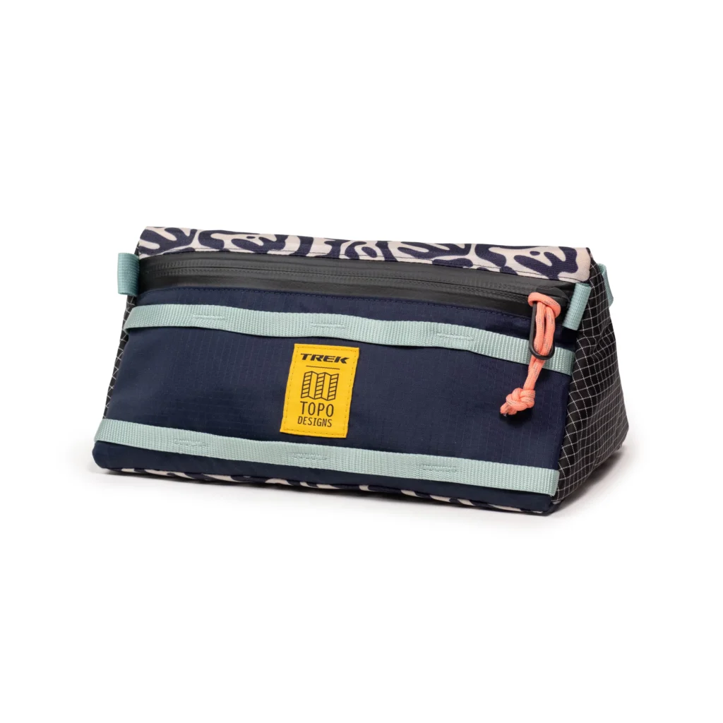 The bag itself features a unique “party/grid” aesthetic, blending vibrant patterns and organic lines that pay homage to both Trek’s high-performance heritage and Topo’s signature bold styling. It’s a limited-edition look that manages to feel retro and futuristic all at once.