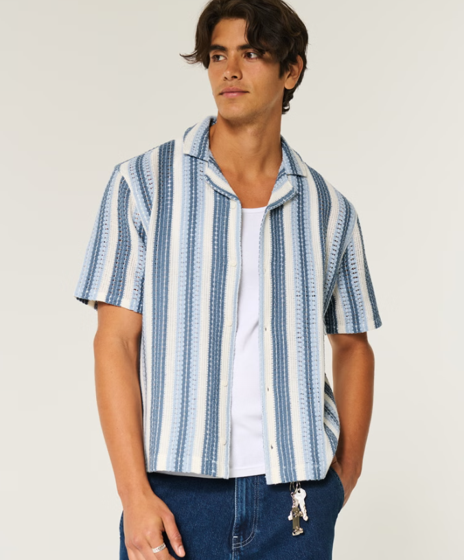 Made with soft crochet-style fabric, this classic button-through shirt features a striped pattern and short sleeves. Button closure, collar. Boxy Fit.