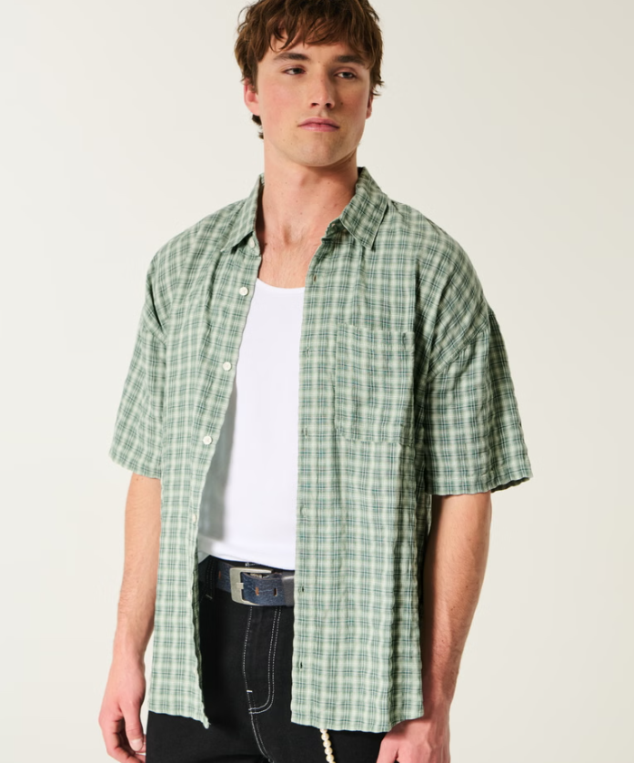This classic short-sleeve shirt is made with soft crochet-style fabric. Button closure, collar, short sleeves. Boxy Fit.