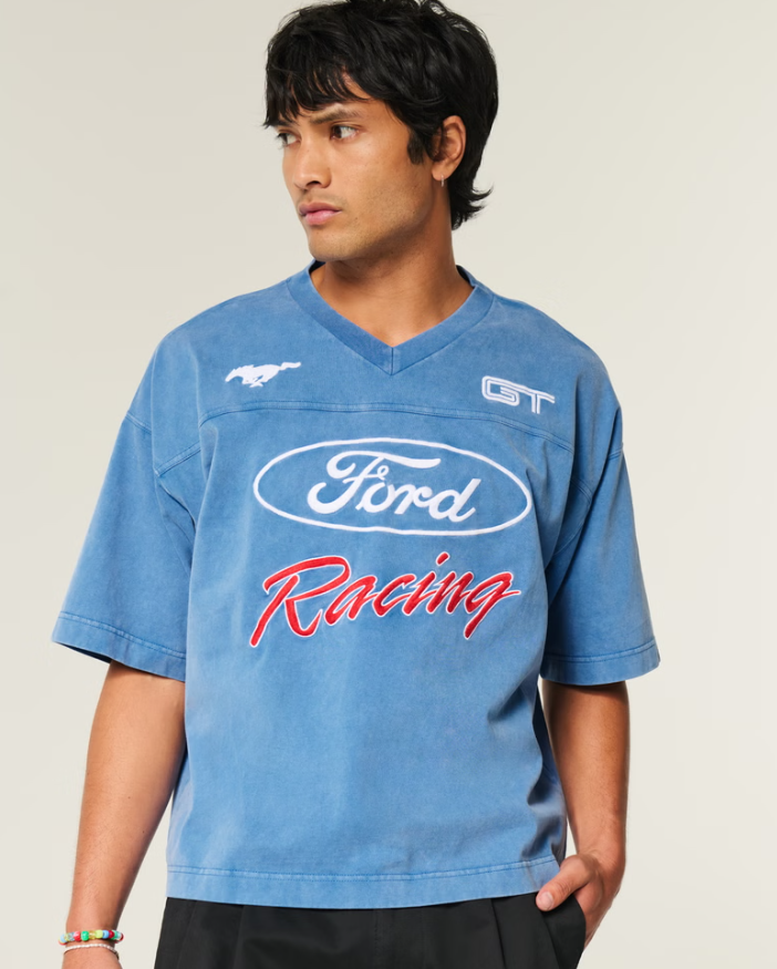 A super soft football tee in heavyweight cotton, featuring official licensed Ford Racing graphic embroidery. V-neckline, short sleeves. Baggy Crop Fit.