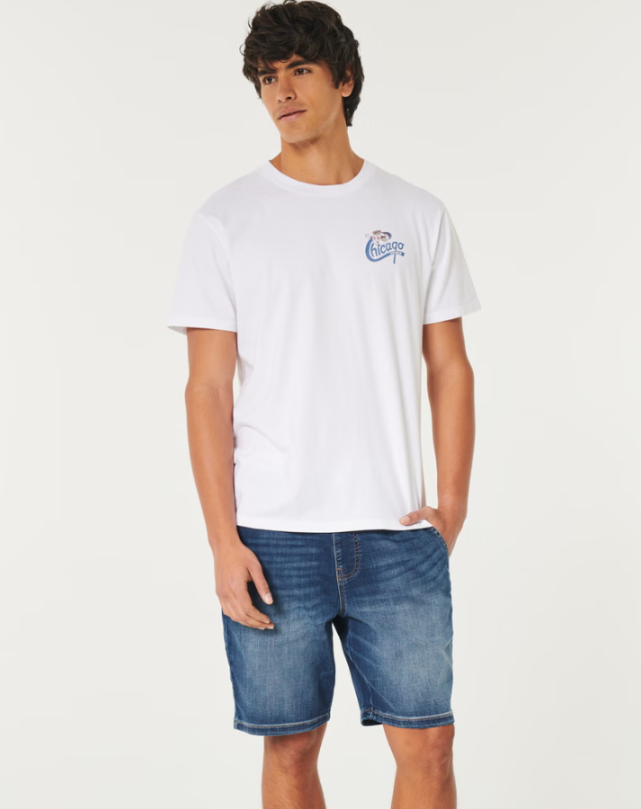 Ultra-comfortable denim jogger shorts in a dark wash that feel just like knit. Soft denim fabric with Hollister Epic Flex stretch, drawstring waist, pockets, 9″ inseam, fading and whiskering. Hits above the knee.