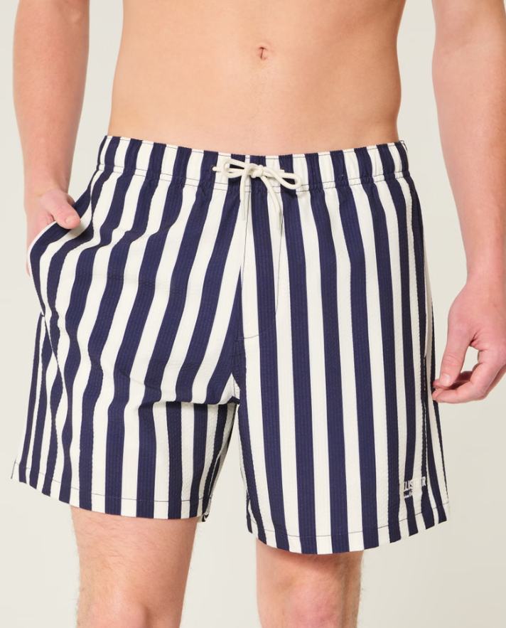 Shorter-length swim trunks that hit mid-thigh. Featuring comfortable 4-way stretch seersucker swim fabric and a 6″ inseam. Front pockets, mesh lining, embroidered logo detail.