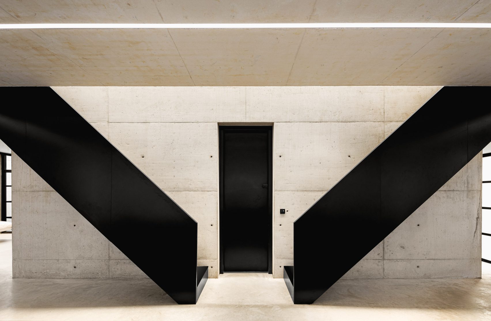 The main living space of Ghost House is arranged around a central island kitchen with a dining area at one end and sofas at the other so it’s clear that the owners favour open plan living at its finest. There is a pair of symmetrical folded-steel staircases on either side of the house’s main entrance which can be followed up to the master bedroom directly above, while a further two guest bedrooms and a cinema room are positioned around the courtyard on the ground floor of the property.