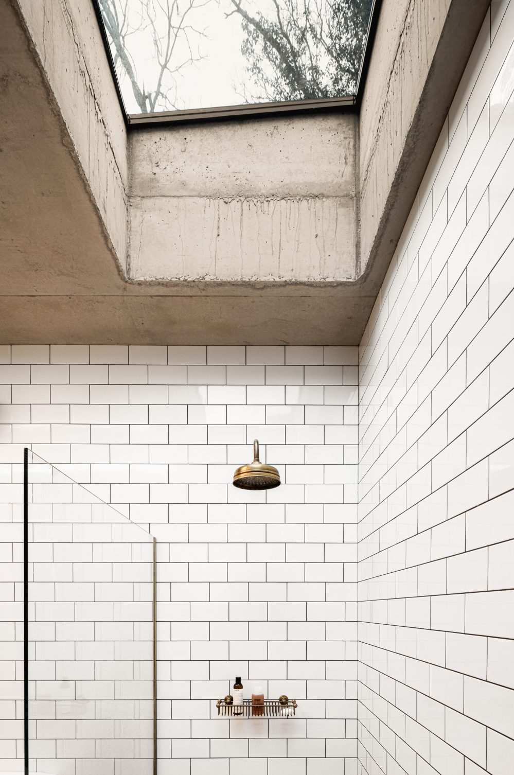 The Ghost House from BPN Architects sits in an enclosed space which is surrounded on three sides by steel-framed windows, while the home is entered through a simple black door set within a concrete wall as an understated entrance into the house that belies the visual treats which lie within. The entrance of the home leads straight into an open-plan living and dining room that is fronted by a double-height glass wall that looks out onto another sunken courtyard and provides a welcoming space for the owners to relax.