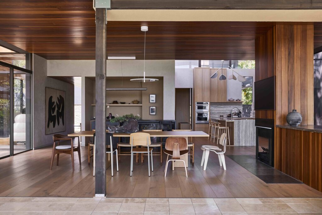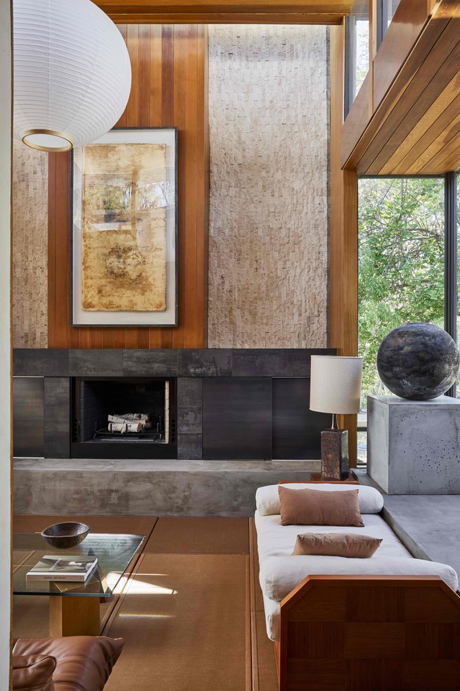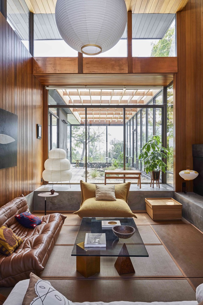 The seamless relationship between indoors and outdoors is a timeless bridge in both Eastern and Western design philosophies. OWIU sought to marry Eastern veneration for natural elements with the stunning Californian landscape and palette. Moving water is a constant, soothing presence throughout the home. The sunroom was transformed into a built-in stream enclosed in glass, creating a serene feeling of continuity between the residential space and the wild.