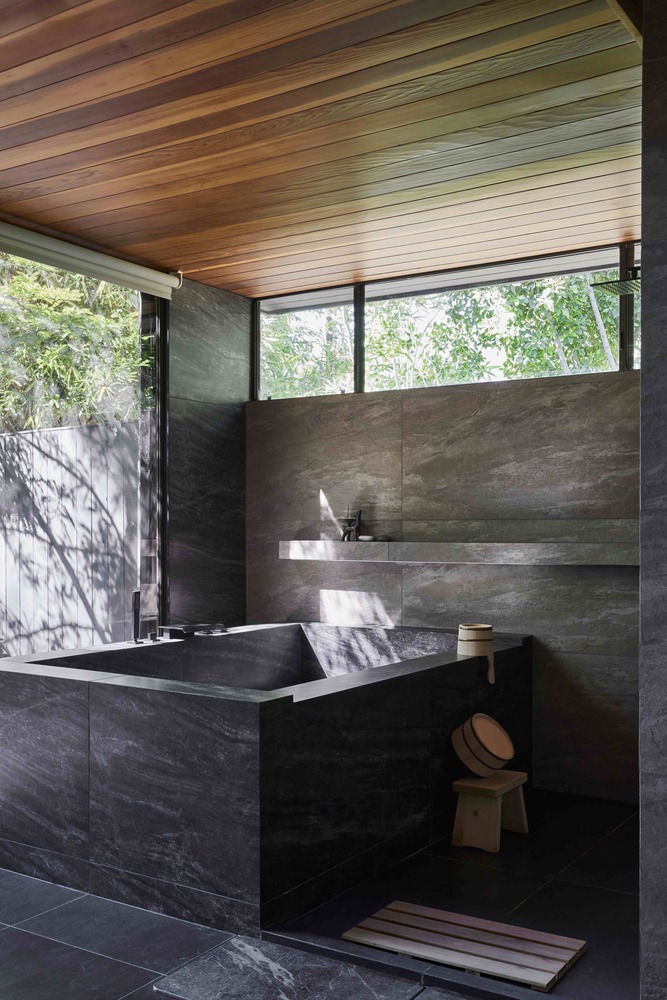 To infuse the home with a truly authentic Japanese element, the couple enlisted the help of their friends at Kuboki Tatami, a family-owned specialist working in Fukushima Prefecture since 1740. This collaboration brought a traditional craft into a modern application in unexpected ways. The sunken pit living room is lined with tatami, adding natural warmth and creating additional seating in a nod to the Asian custom of sitting on the floor for casual socializing. The bed frame also features custom-treated black tatami, adding a subtle, dramatic texture to a minimalist space.