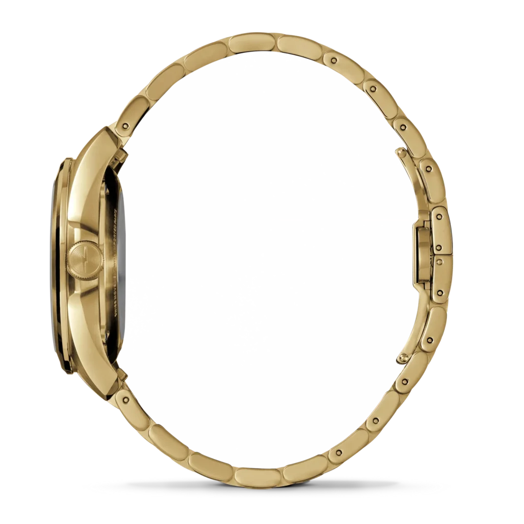 Shinola has employed alternating brushed and polished surfaces to give the gold finish a three-dimensional character, ensuring it catches the light in a way that is sophisticated rather than shouting for attention.