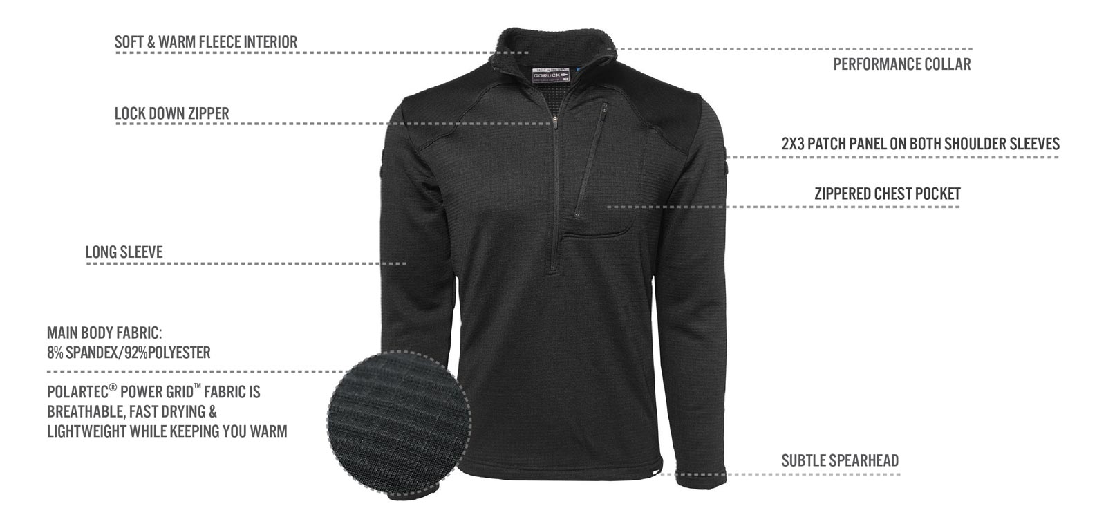 There are some great design elements to be found within this Goruck Grid Fleece Half Zip which act as the catalyst for its performance and popularity amongst the outdoors inclined. Some of the most useful design features of this superb piece of outerwear includes a lock down zipper, zippered chest pocket, velcro spot on sleeve to add your own patch and long sleeves to help keep the elements at bay in the colder months of the year.